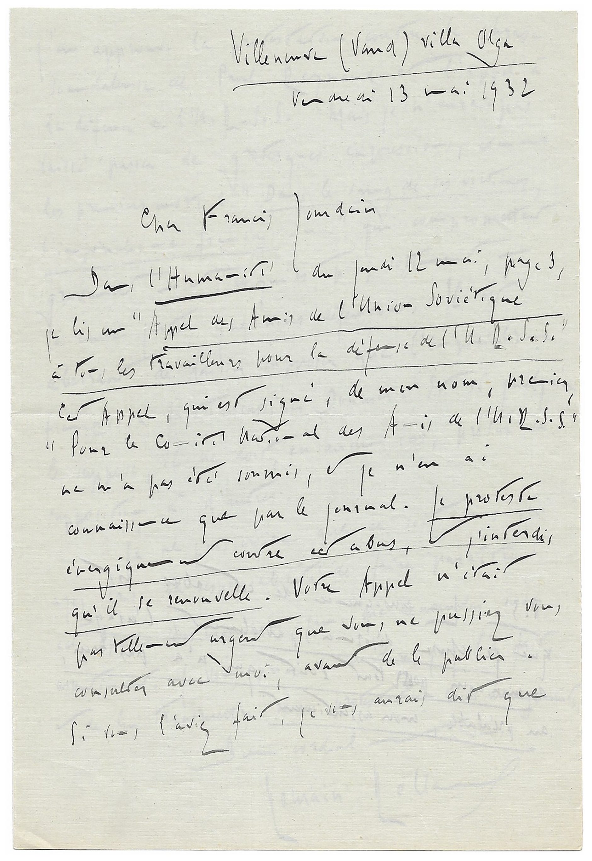 Outraged by the abusive use of his name in an appeal published by L’Humanité, Romain Rolland addressed a vigorous protest to Francis Jourdain