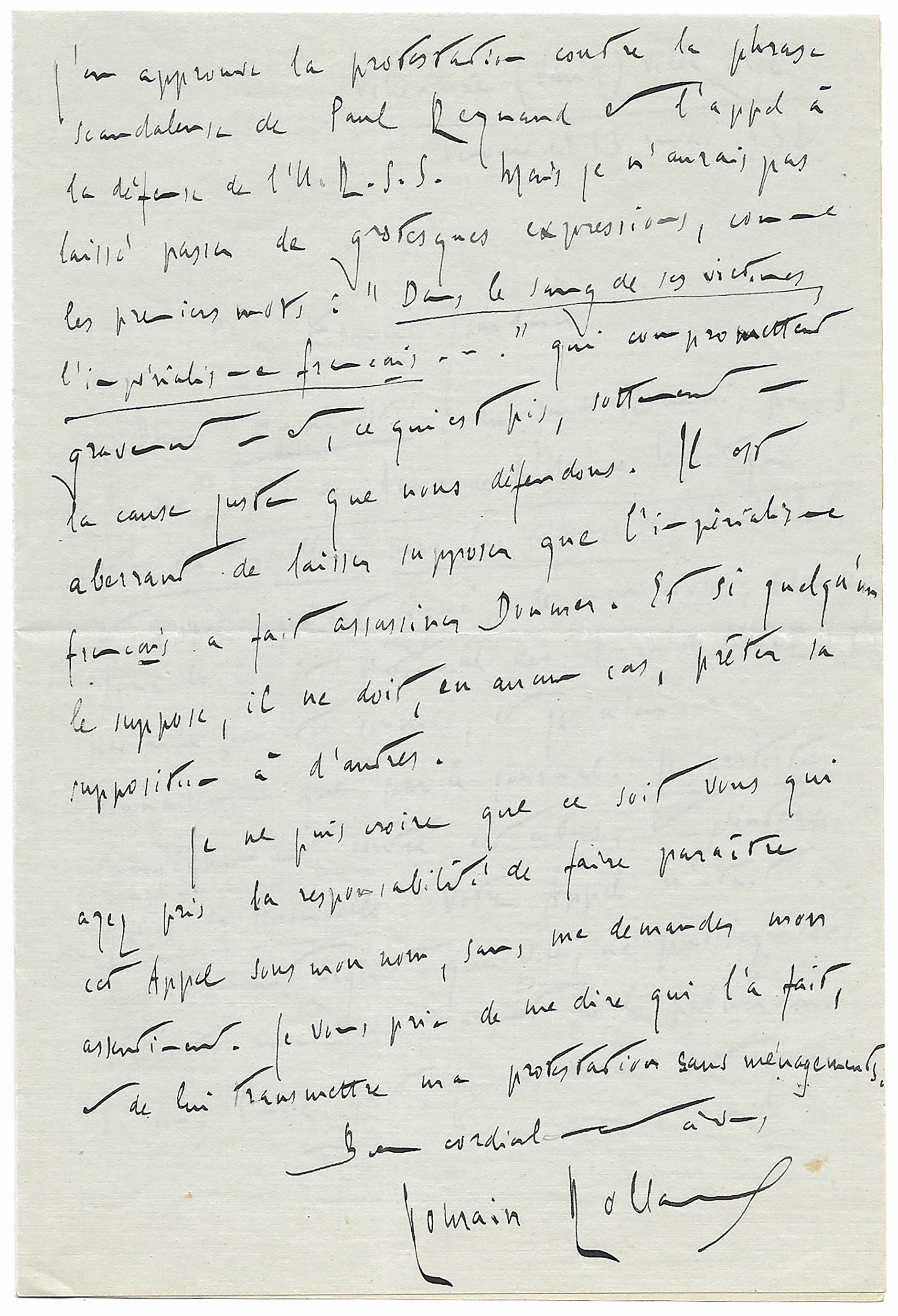 Cet appel, qui est signé de mon nom premier ‘Pour le Comité National des Amis de l’U.R.S.S.’ ne m’a pas été soumis, et je n’en ai connaissance que par le journal. Je proteste énergiquement contre cet abus, j’interdis qu’il se renouvelle. Votre appel n’était pas tellement urgent que vous ne puissiez vous consulter avec moi, avant de le publier. Si vous l’aviez fait, je vous aurais dit que j’en approuve la protestation contre la phrase scandaleuse de Paul Reynaud et l’appel à la défense de l’U.R.S.S. mais je n’aurais pas laissé passer de grotesques expressions, comme les premiers mots : ‘Dans le sang de ses victimes, l’impérialisme français… » qui compromettent gravement et, ce qui est pis, sottement la cause que nous défendons. Il est aberrant de laisser supposer que l’impérialisme français a fait assassiner Doumer. Et si quelqu’un le suppose, il ne doit, en aucun cas, prêter la supposition à d’autres.