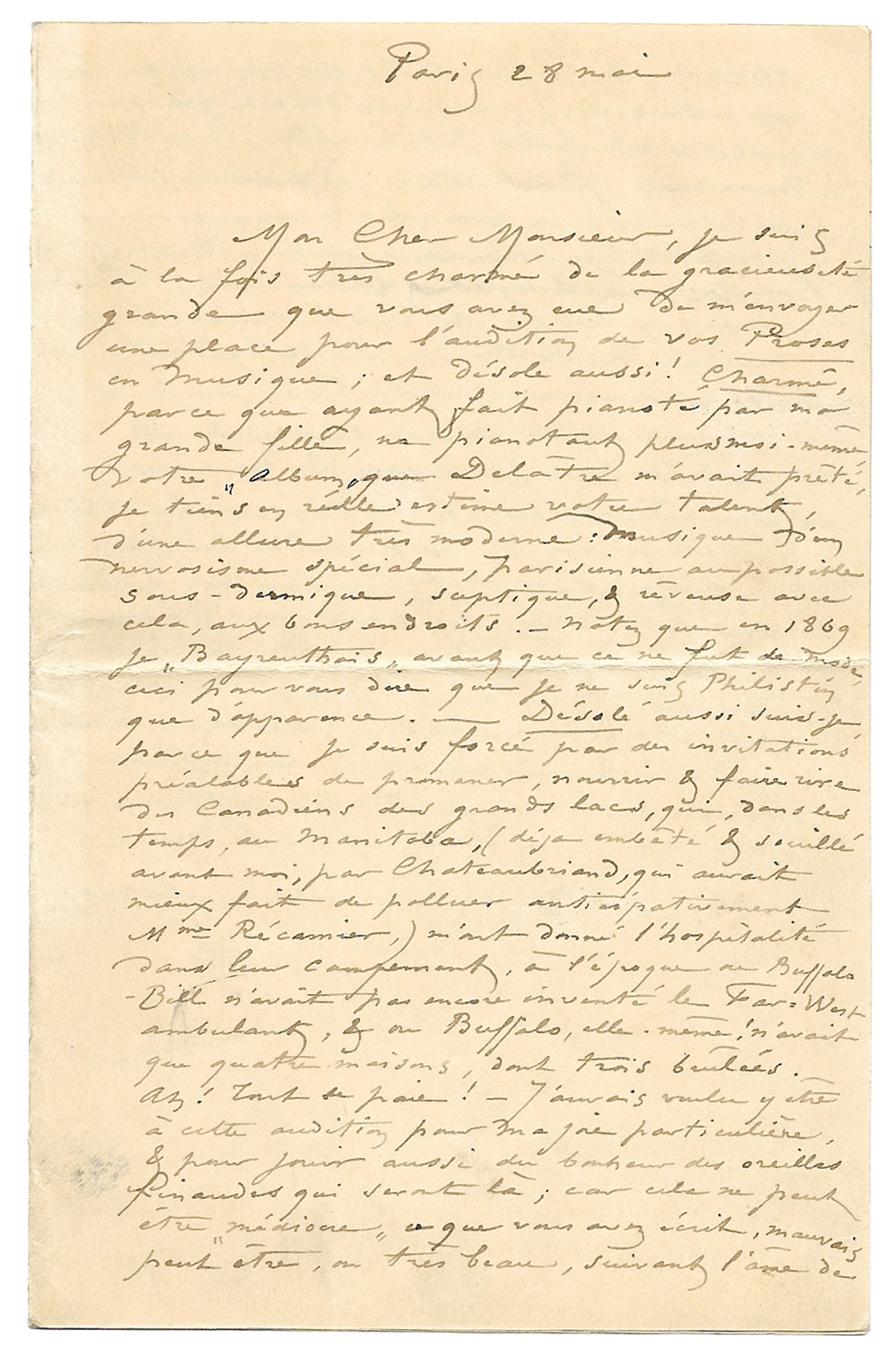 Je suis à la fois très charmé de la gracieuseté grande que vous avez eue de m’envoyer une place pour l’audition de vos Proses en Musique ; et désolé aussi ! Charmé, parce que ayant fait pianoté par ma grande fille, ne pianotant plus moi-même, votre “album”, que [Auguste] Delâtre m’avait prêté, je tiens en réelle estime votre talent, d’une allure très moderne : musique d’un nervosisme spécial, parisienne au possible sous-dermique, sceptique, & rêveuse avec cela, aux bon endroits. – Notez que en 1869 je “Bayreuthais” [allusion à la salle d’opéra de Wagner dans la ville de Bayreuth] avant que ce ne fut de mode, ceci pour vous dire que je ne suis Philistin que d’apparence. – Désolé aussi suis-je, parce que je suis forcé par des invitations préalables de promener, nourrir & faire rire des Canadiens des grands lacs, qui, dans les temps, au Manitoba [province canadienne], (déjà embêté et souillé avant moi, par Chateaubriand [allusion à son roman Les Natchez], qui aurait mieux fait de polluer anticipativement Mme Récamier), m’ont donné l’hospitalité de leur campement, à l’époque où Buffalo-Bill n’avait pas encore inventé le Far-West ambulant […]