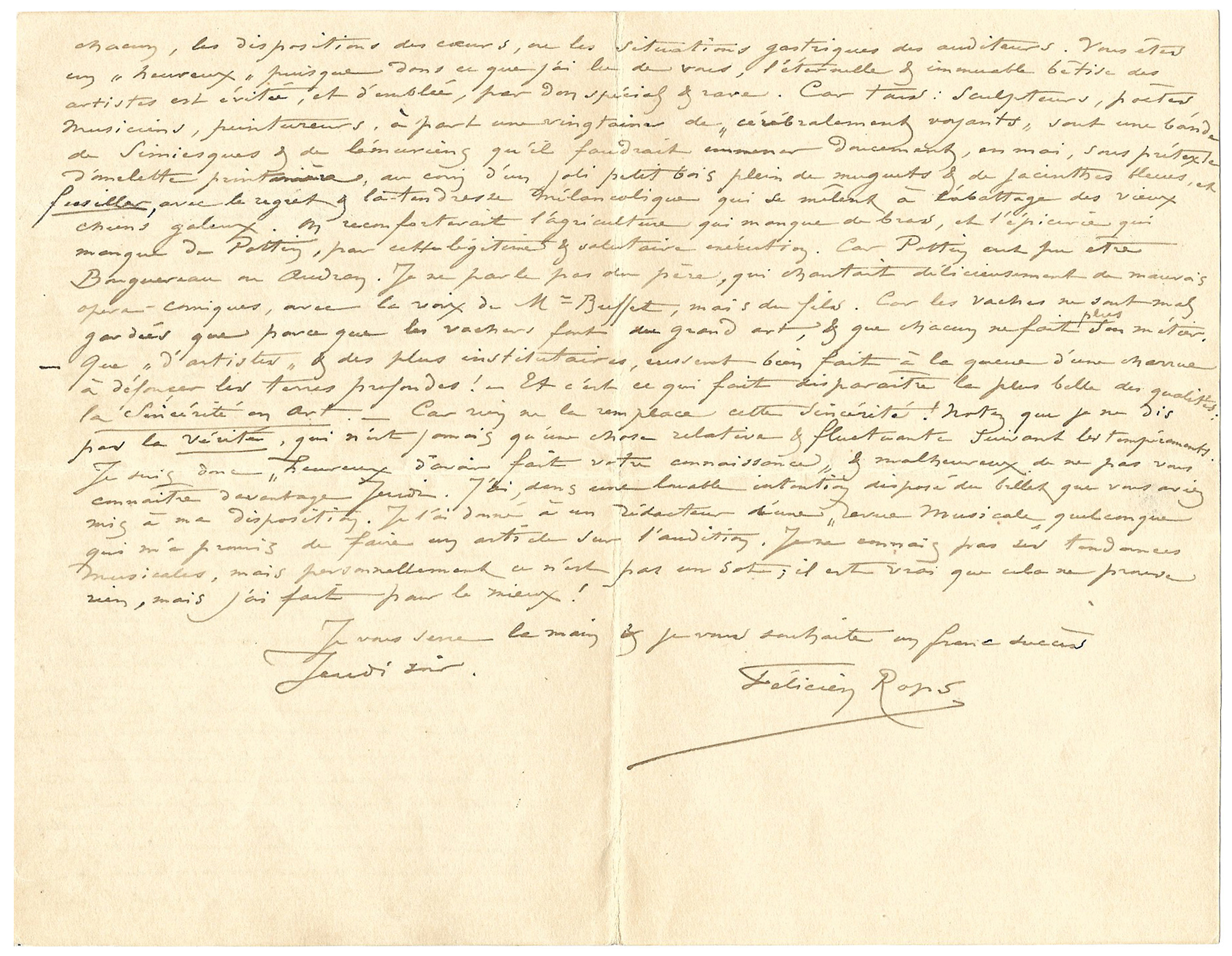 Rops declines an invitation to a musical performance in a prolific and zany letter, delivering a few aspects of his own past along with an implacable judgment on the art of his contemporaries