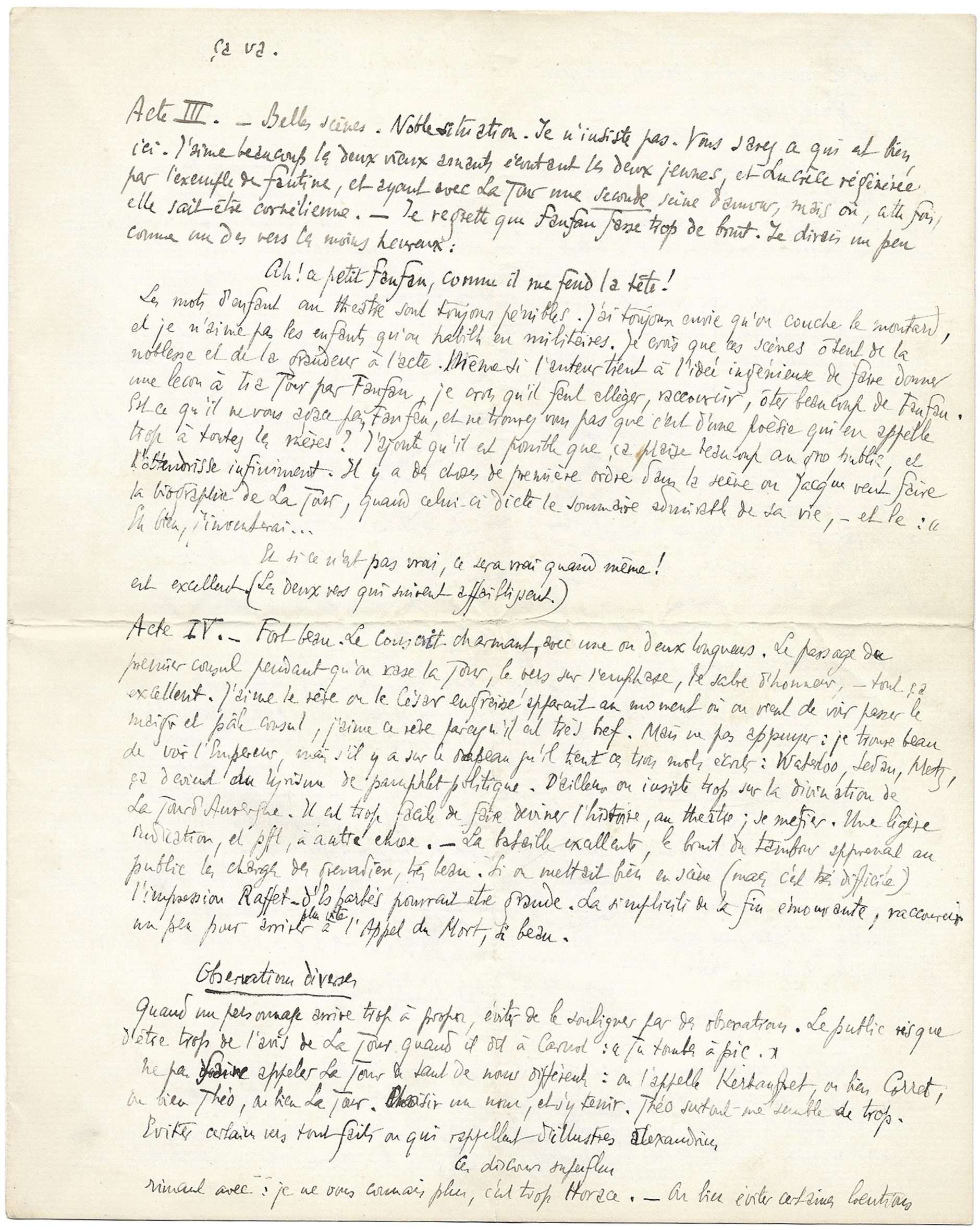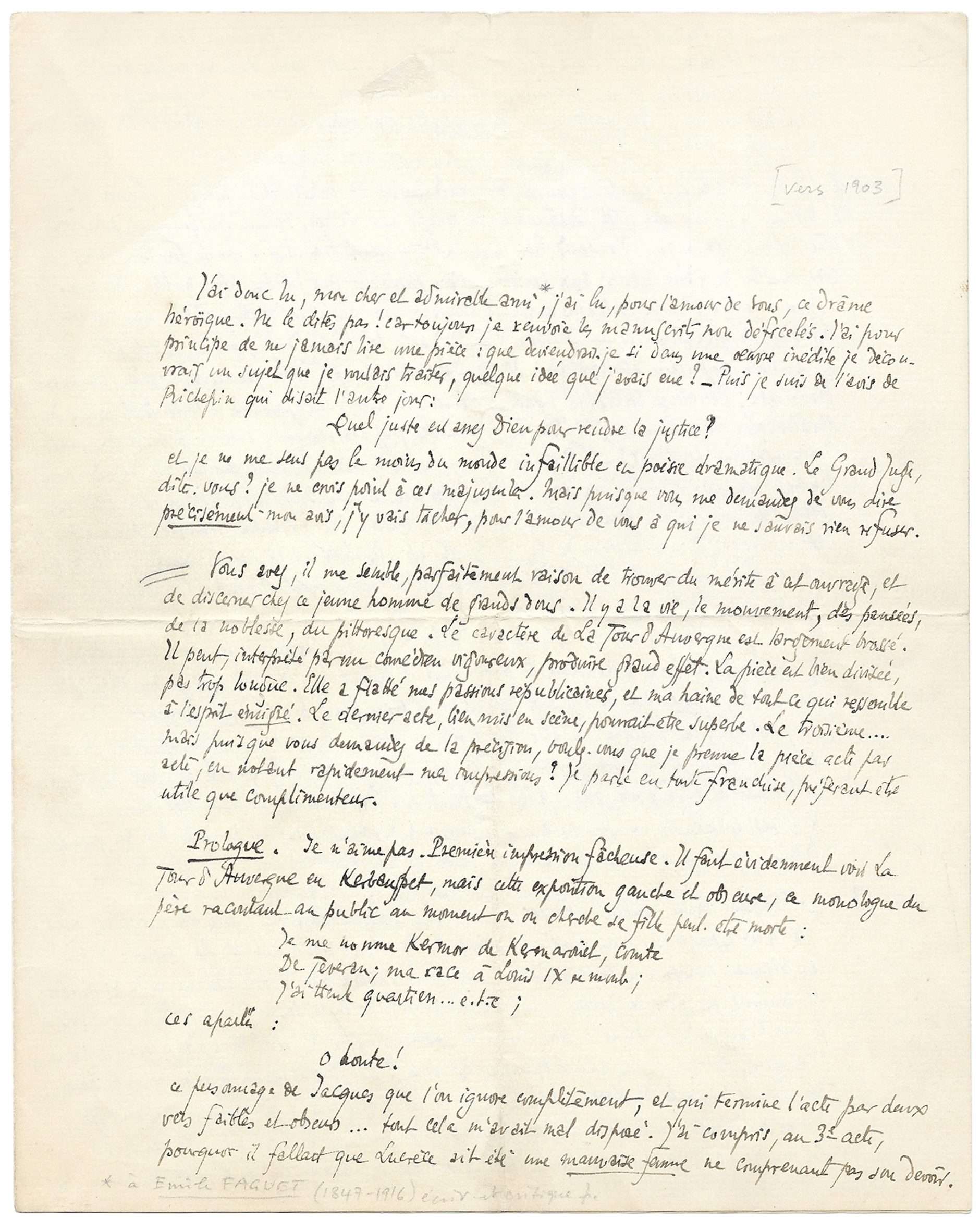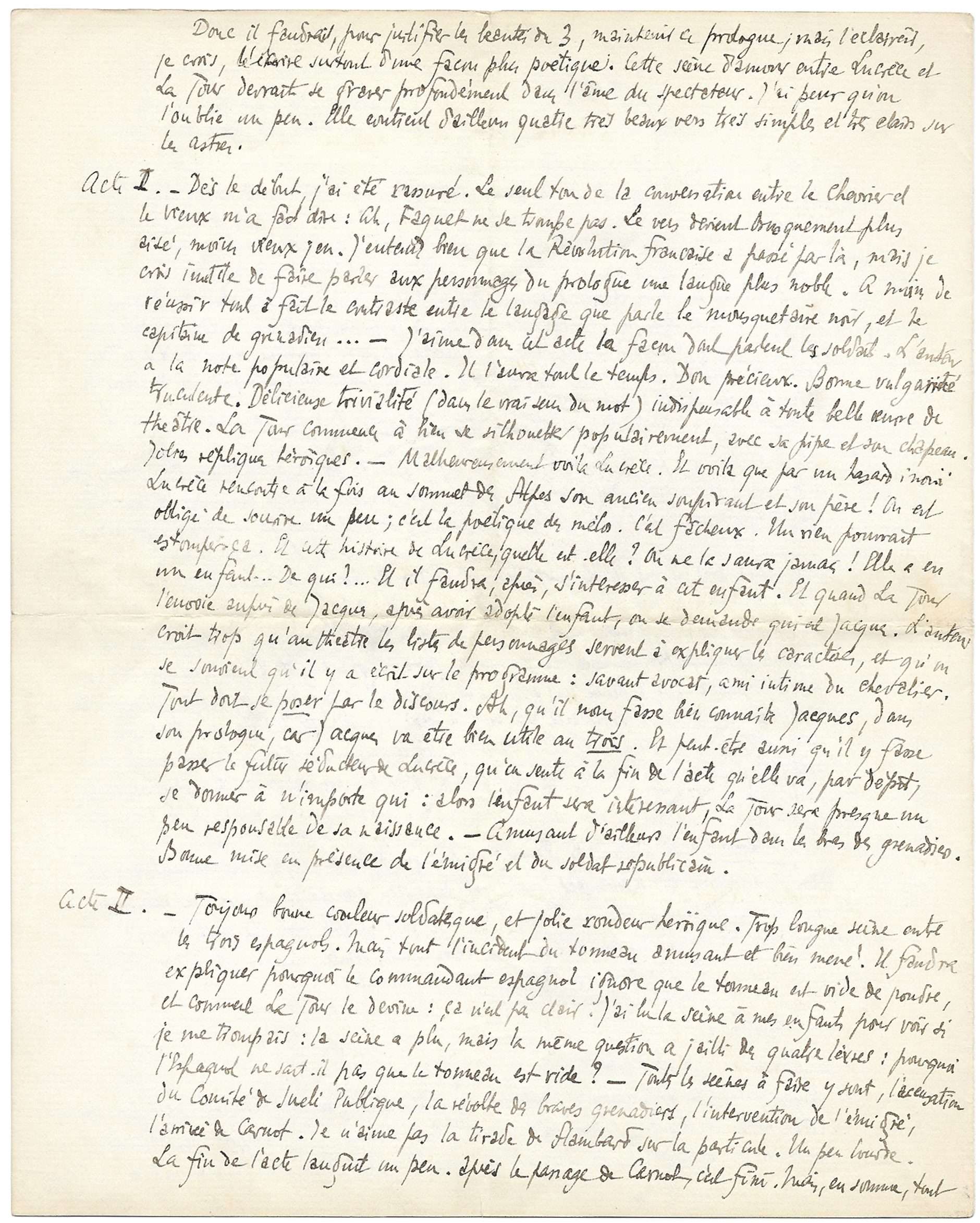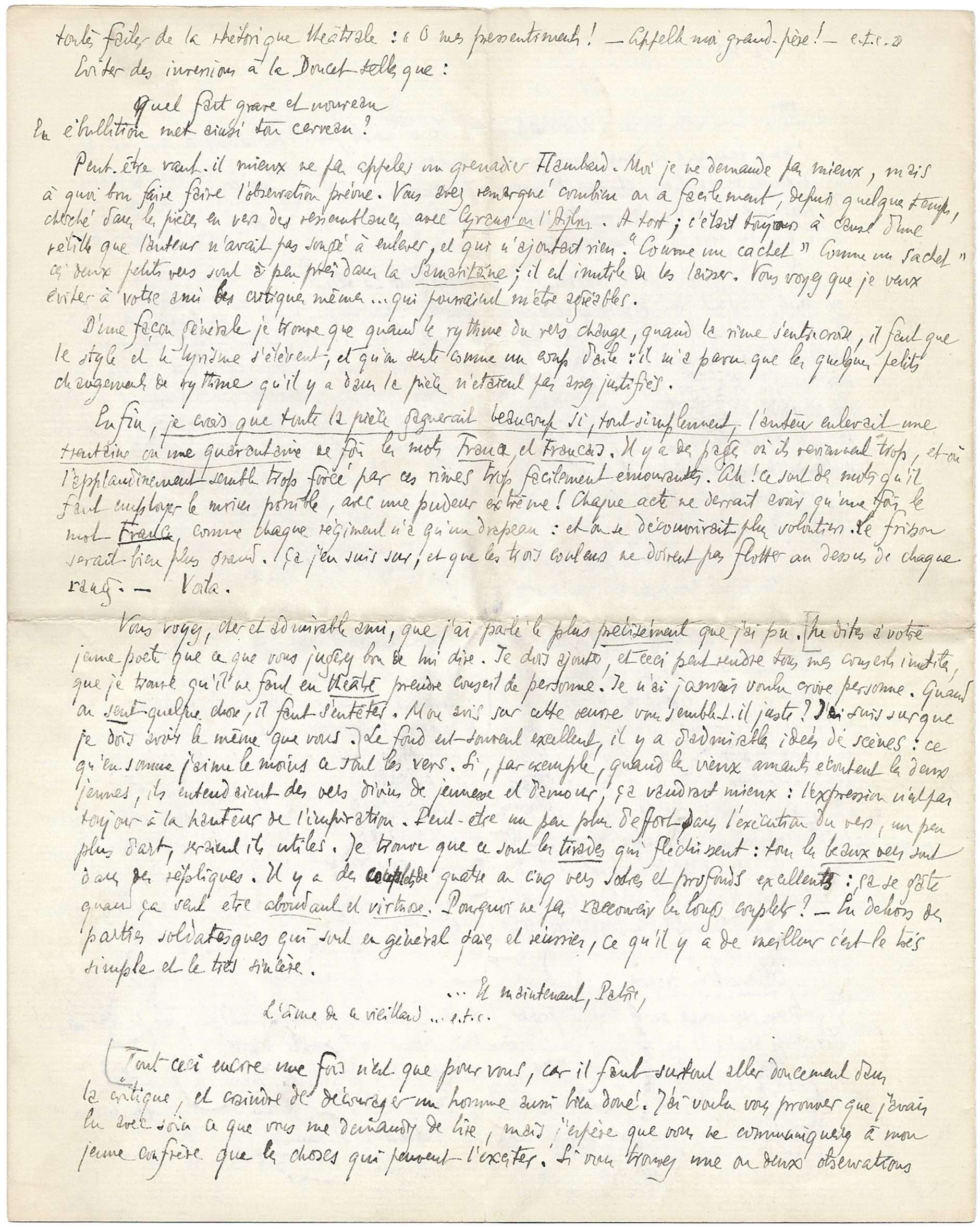 Vous voyez, cher et admirable ami, que j’ai parlé le plus précisément que j’ai pu. Ne dites à votre jeune poète que ce que vous jugerez bon de lui dire. Je dois ajouter, et ceci peut rendre tous mes conseils inutiles, que je trouve qu’il ne faut en théâtre prendre conseil de personne. Je n’ai jamais voulu croire personne. Quand on sent quelque chose, il faut s’entêter.[…] Peut-être un peu plus d’effort dans l’exécution du vers, un peu plus d’art, seraient-ils utiles. Je trouve que ce sont les tirades qui fléchissent : tous les beaux vers sont dans des répliques. […]