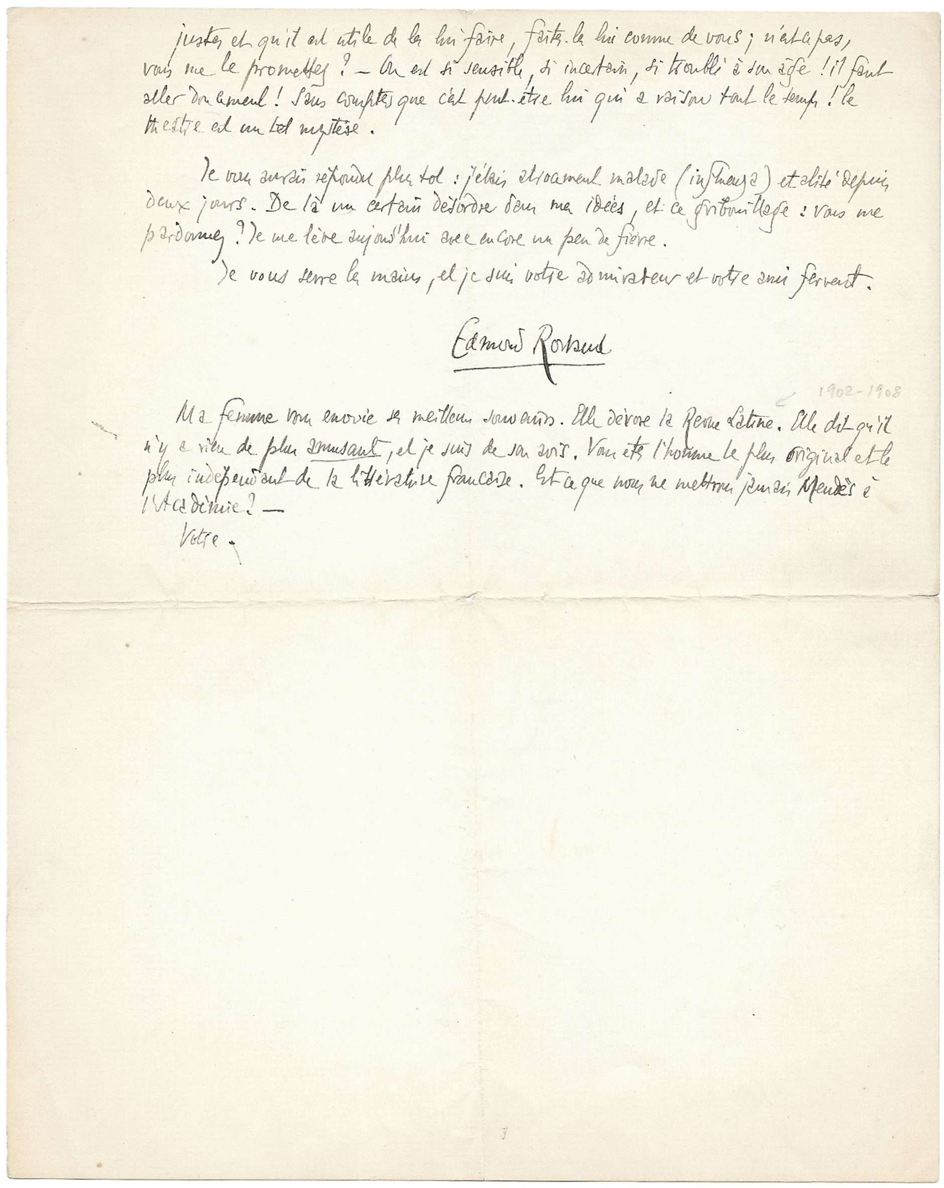 Ma femme vous envoie ses meilleurs souvenirs. Elle dévore la Revue Latine. Elle dit qu’il n’y a rien de plus amusant, et je suis de son avis. Vous êtes l’homme le plus original et le plus indépendant de la littérature française. »