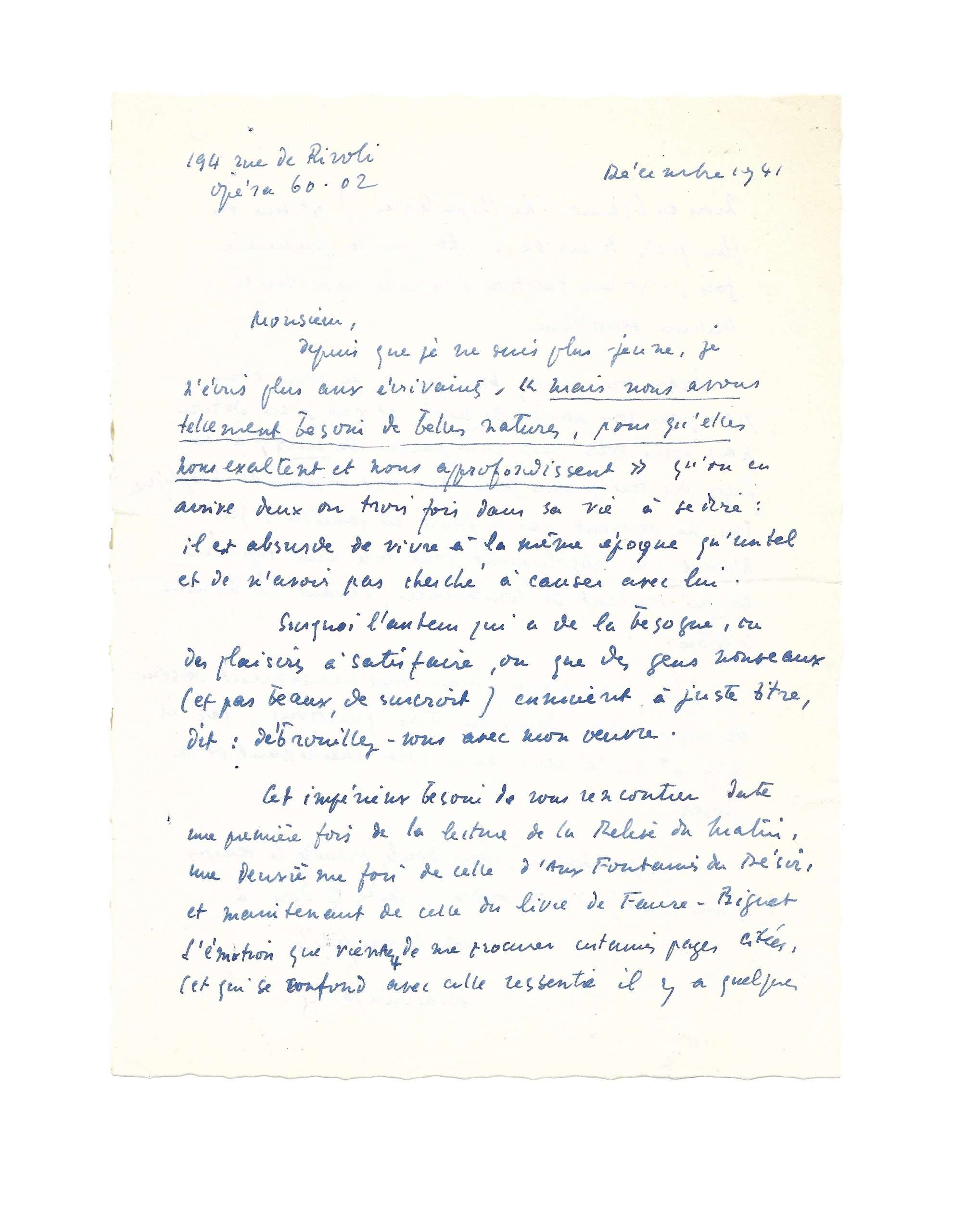 Cet impérieux besoin de vous rencontrer dans une première fois de la lecture de la Relève du matin, une deuxième fois de celle d’Aux fontaines du désir, et maintenant de celle du livre de Faure-Biguet [Les enfances de Montherlant (de neuf à vingt ans, Plon]. L’émotion que viennent me procurer certaines pages citées (et qui se confond avec elle ressenties il y a quelques mois en lisant “Les Chevaleries”) [Article de Montherlant paru dans la NRF en janvier 1941] est une des plus fortes de ma vie. Et pour la première fois, c’est une émotion à laquelle ne se mêle aucune sensiblerie.