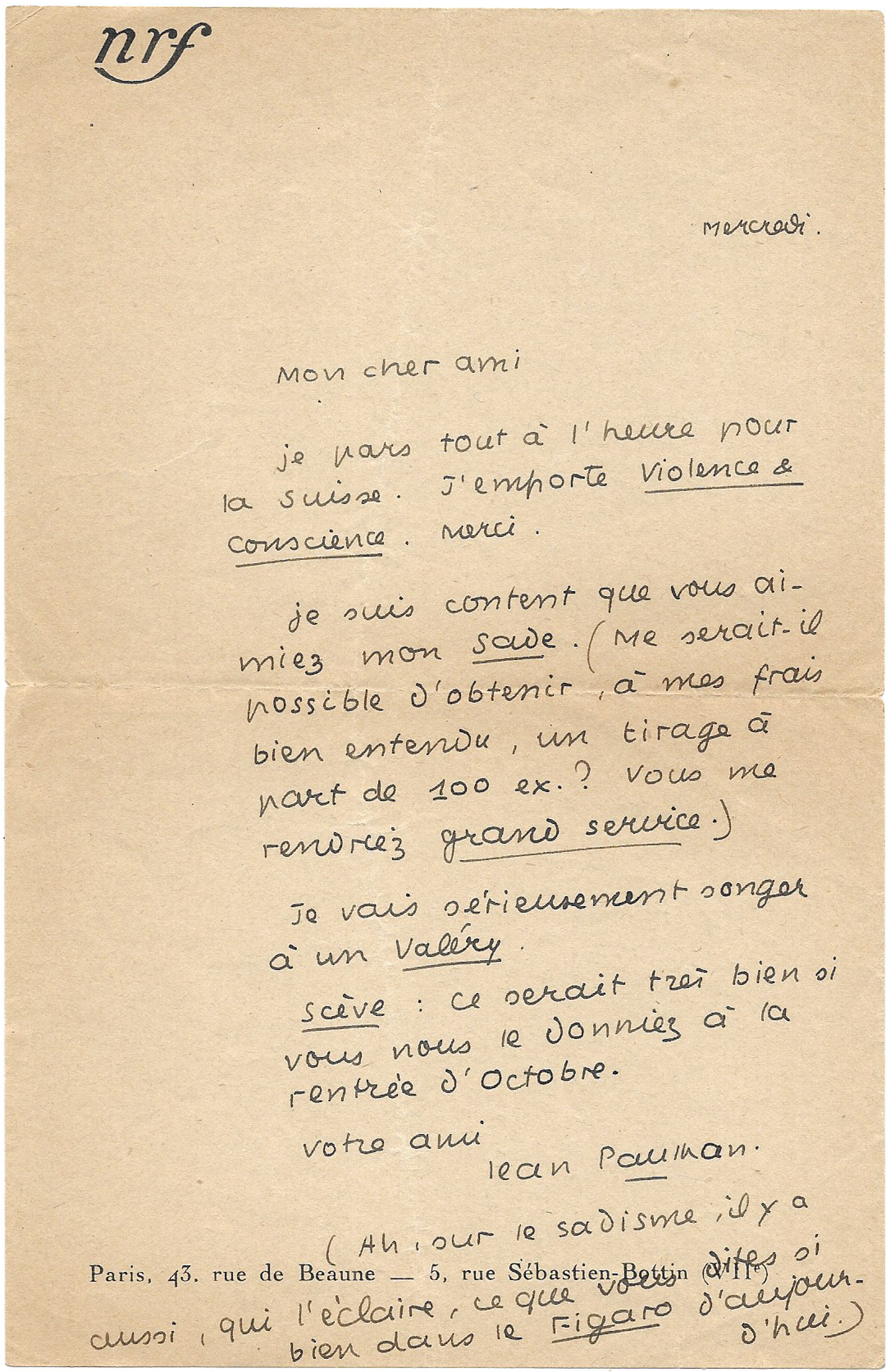 S.l., « Wednesday » [June ? 1945], 1 p. in-8° on NRF letterhead