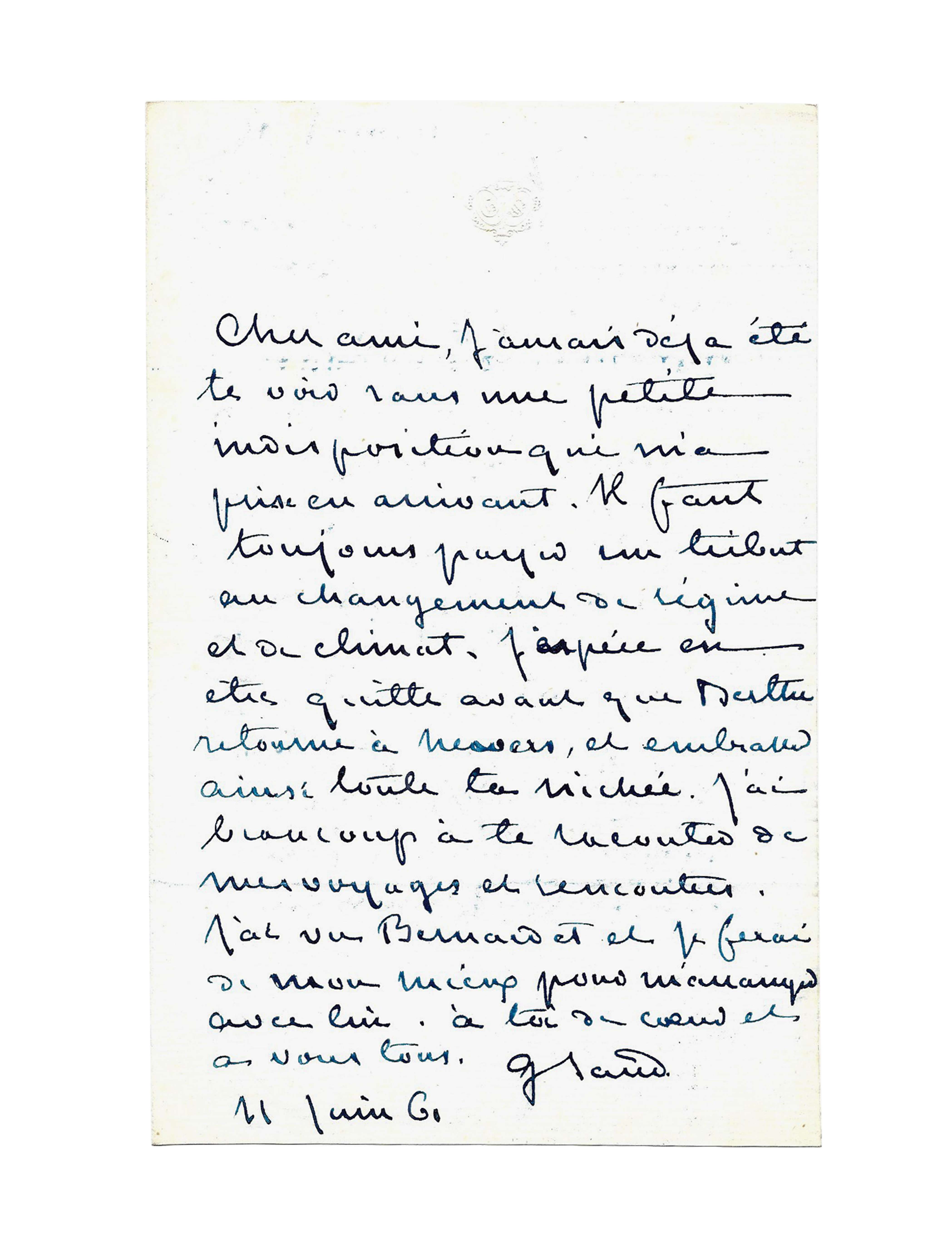 J’aurais déjà été te voir sans une petite indisposition qui m’a prise en arrivant [du 9 au 12 juin, Sand souffre de l’estomac. Le docteur Dachy a été appelé deux fois]. Il faut toujours payer un tribut au changement de régime et de climat. J’espère en être quitte avant que Berthe [fille de Charles Duvernet, dont George Sand est la marraine] ne retourne à Nevers, et embrasser ainsi toute ta nichée. J’ai beaucoup à te raconter de mes voyages et rencontres. J’ai vu [Sylvain] Bernardet [dont Sand avait reçu la visite le jour même] et je ferai de mon mieux pour m’arranger avec lui. À toi de cœur et à vous tous.