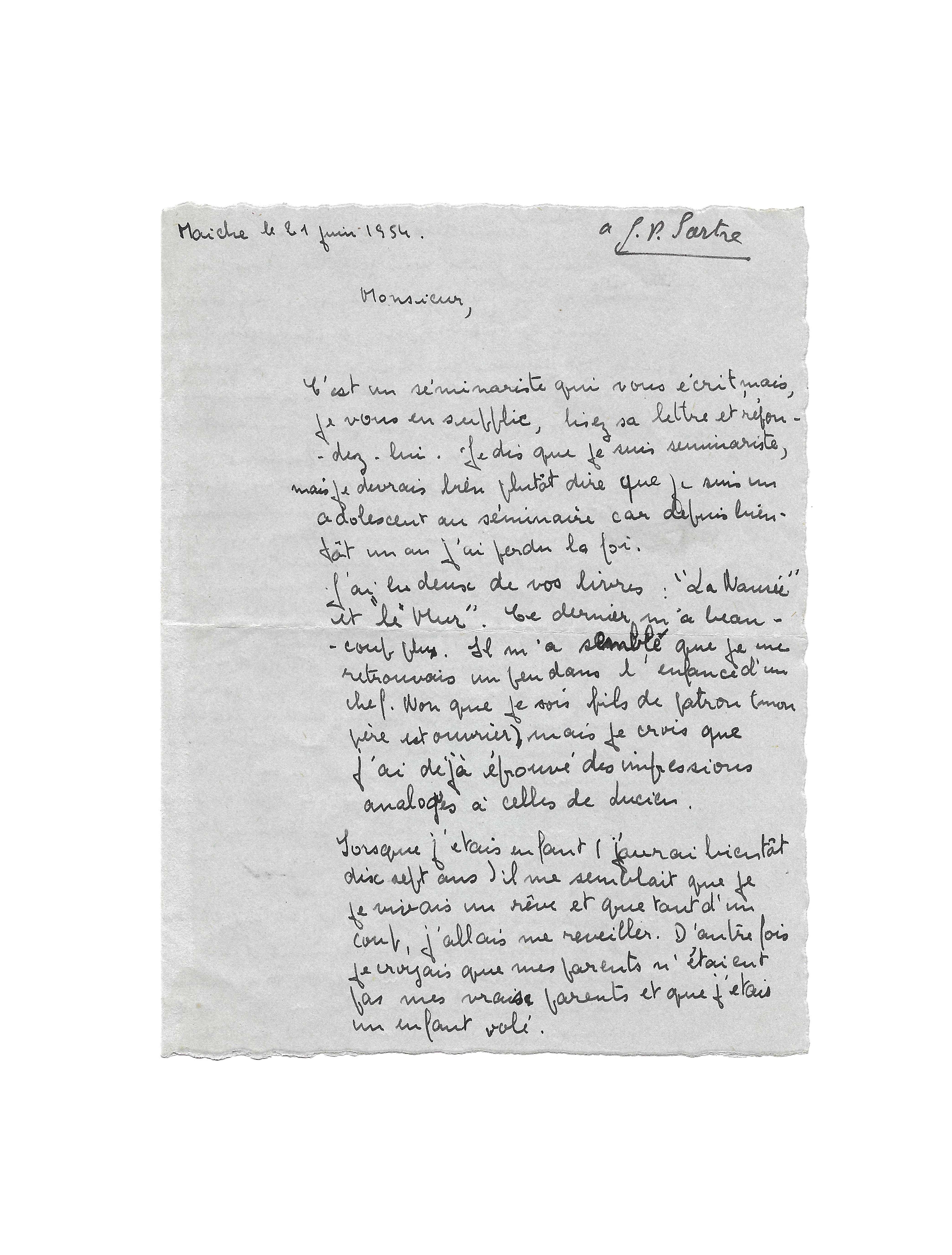 J’ai lu deux de vos livres : “La Nausée” et “Le Mur”. Ce dernier m’a beaucoup plu. Il m’a semblé que je me retrouvais un peu dans l’enfance d’un chef. Non que je sois fils de patron (mon père est ouvrier) mais je crois que j’ai déjà éprouvé des impressions analogues à celles de Lucien.