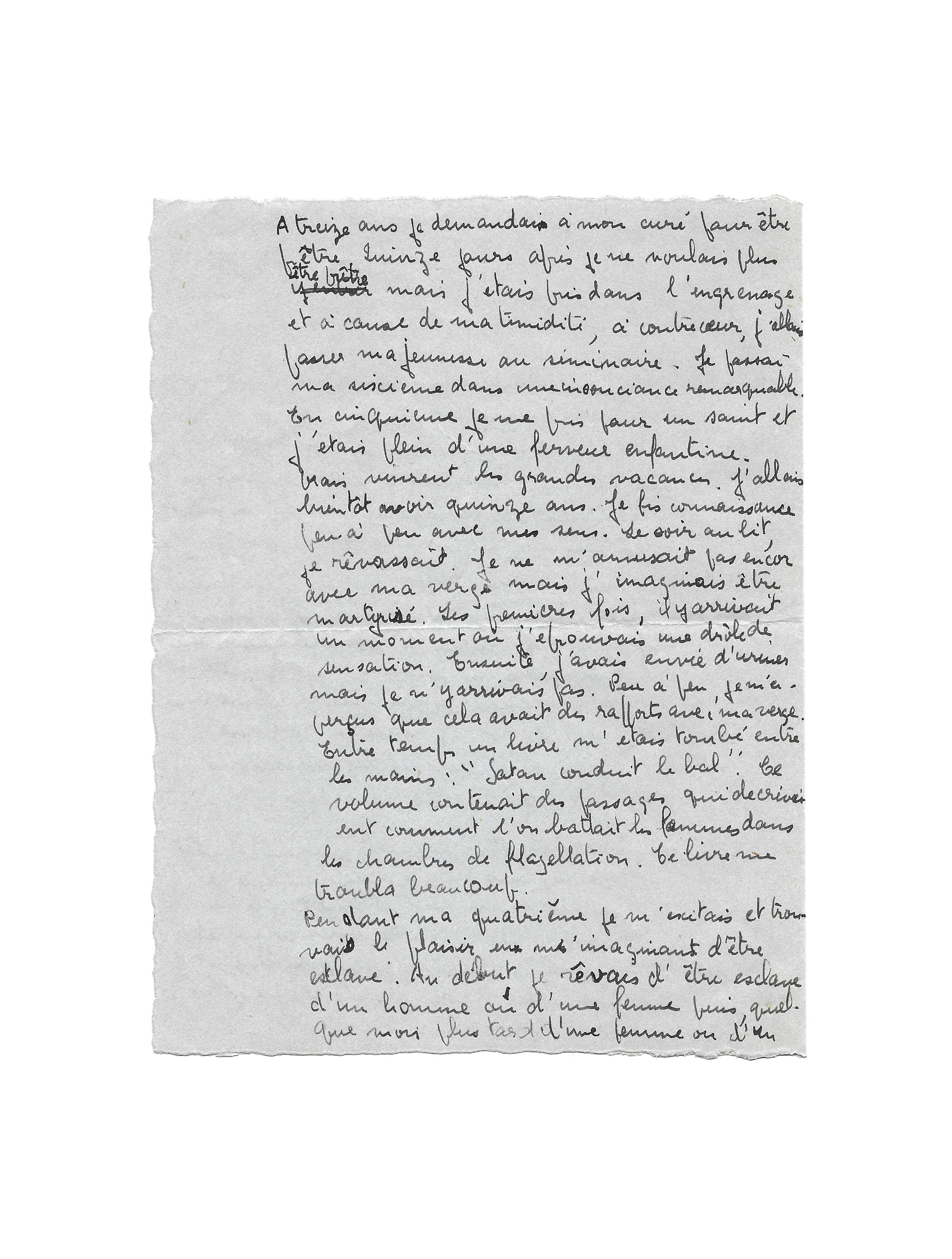 Mais vinrent les grandes vacances. J’allais bientôt avoir quinze ans. Je fis connaissance peu à peu avec mes sens. Le soir au lit, je rêvassais. je ne m’amusais pas encore avec ma verge mais j’imaginais être martyrisé. Les premières fois, il y arrivait un moment ou j’éprouvais une drôle de sensation. Ensuite, j’avais envie d’uriner mais je n’y arrivais pas. Peu à peu, je m’aperçus que cela avait des rapports avec ma verge. Entre temps un livre m’était tombé entre les mains : “Satan conduit le bal” [roman de Georges Anquetil paru en 1925]. Ce roman décrivait comment l’on battait les femmes dans les chambres de flagellation. Ce livre me troubla beaucoup.