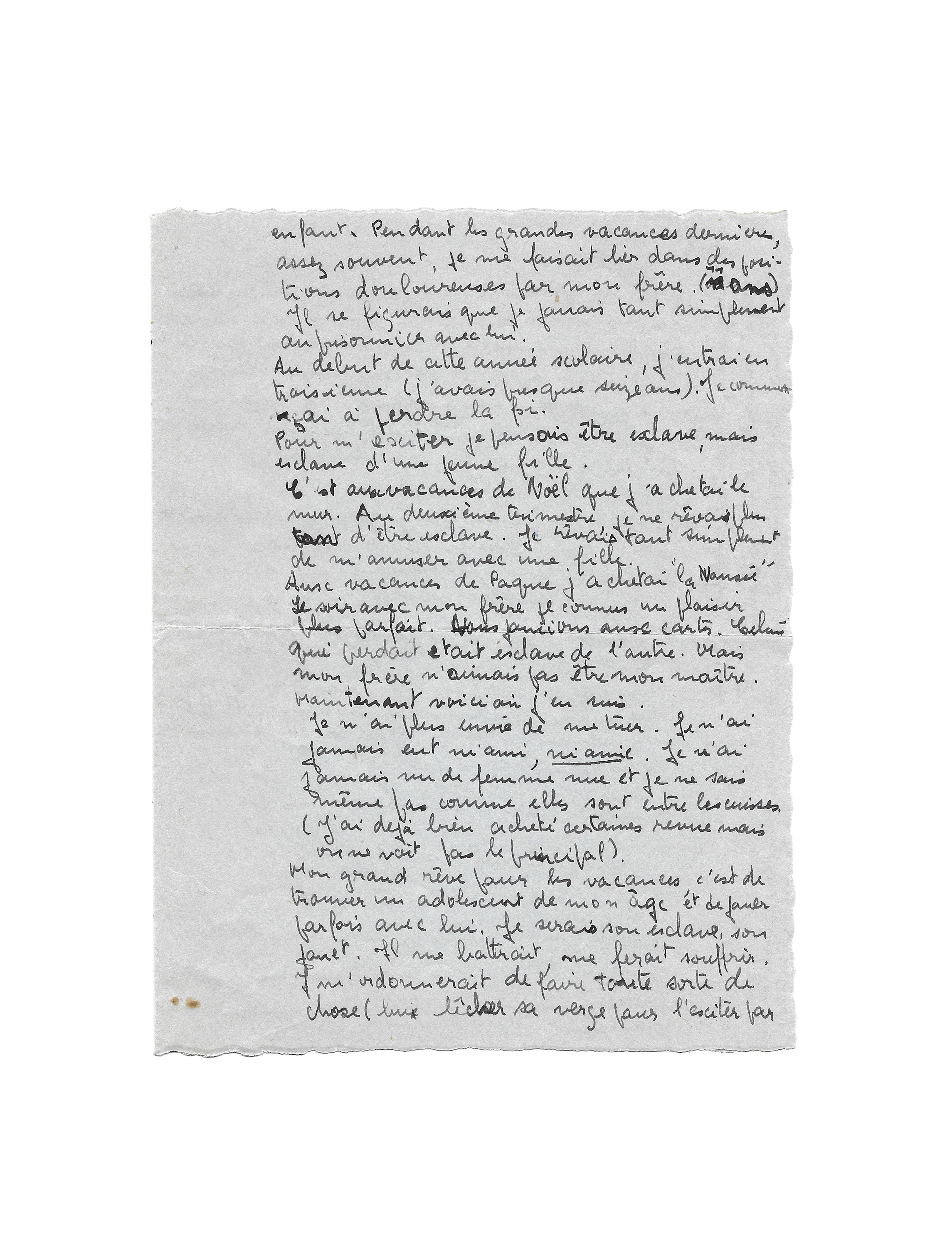Pendant ma quatrième je m’excitais et trouvais le plaisir en m’imaginant d’être esclave. Au début, je rêvais d’être esclave d’un homme ou d’une femme puis, quelques mois plus tard d’une femme ou d’un enfant. Pendant les grandes vacances dernières, assez souvent, je me faisait lier dans des positions douloureuses par mon frère (11 ans). Il se figurais [sic] que je jouais tout simplement au prisonnier avec lui.