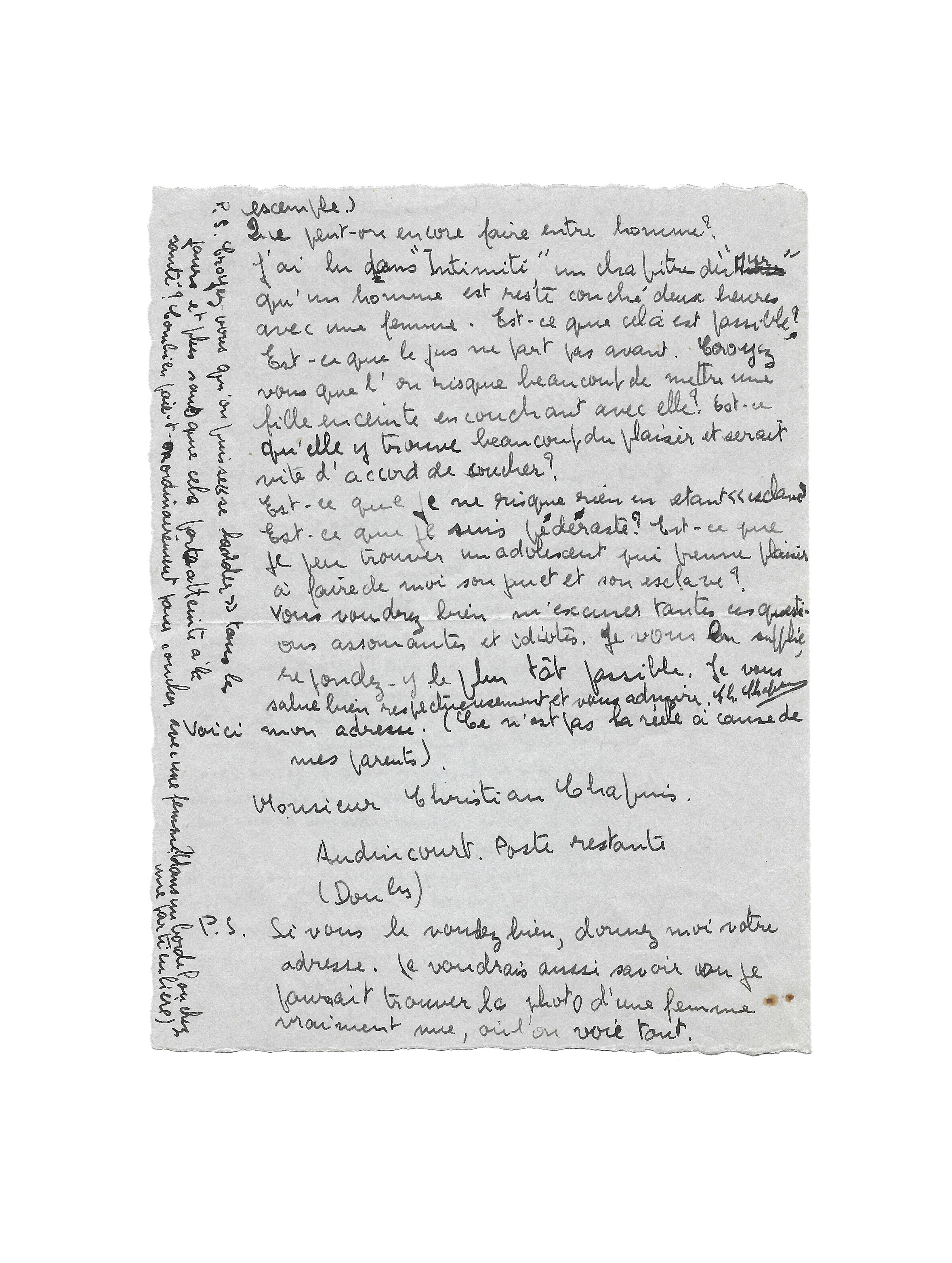 P.S. Si vous le voulez bien, donnez-moi votre adresse. Je voudrais aussi savoir ou je pourrait [sic] trouver les photos d’une femme vraiment nue […]