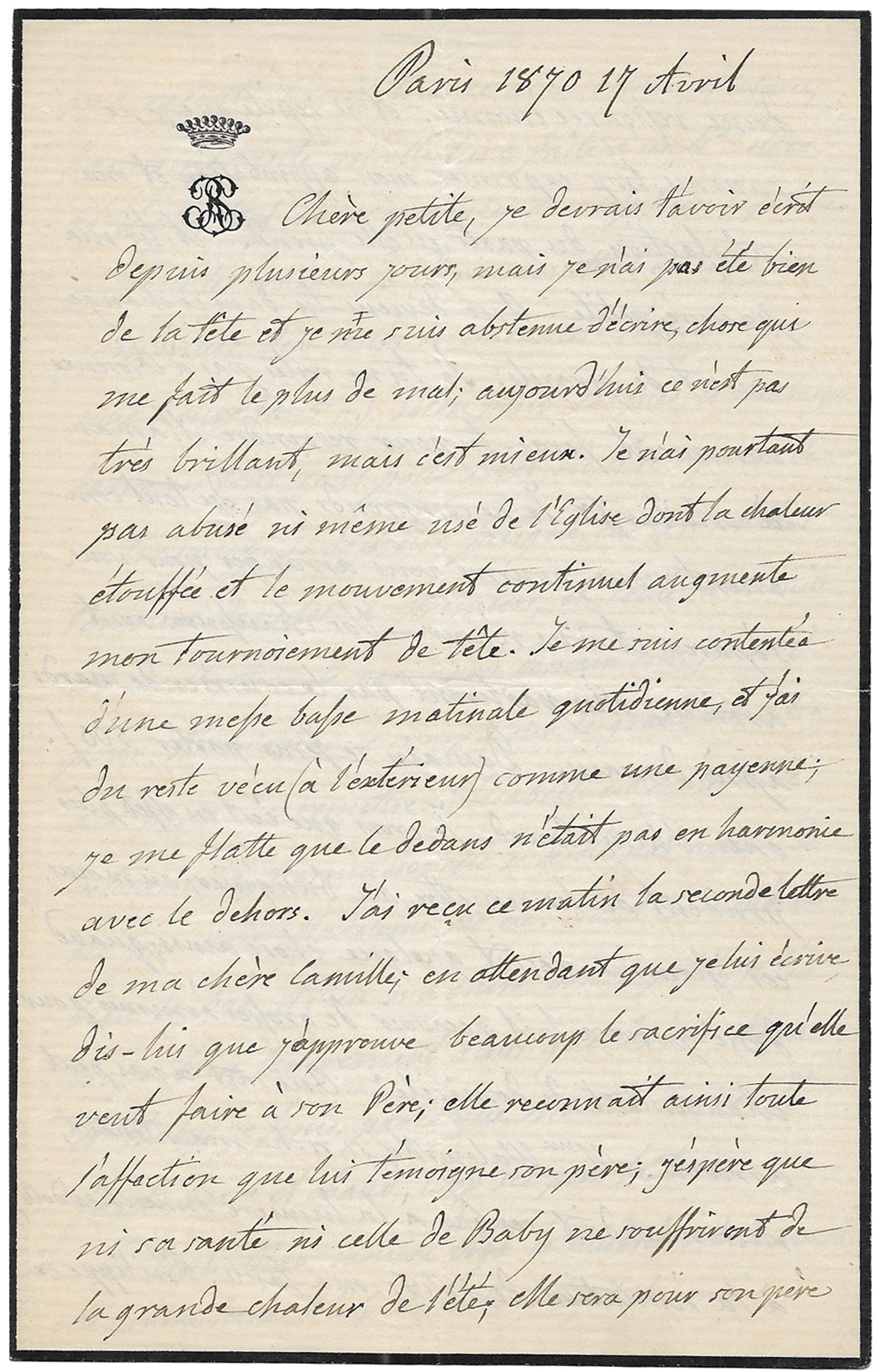 Paris, 17 Apr. 1870, 3 pp. in-8°, on mourning paper, in black ink
