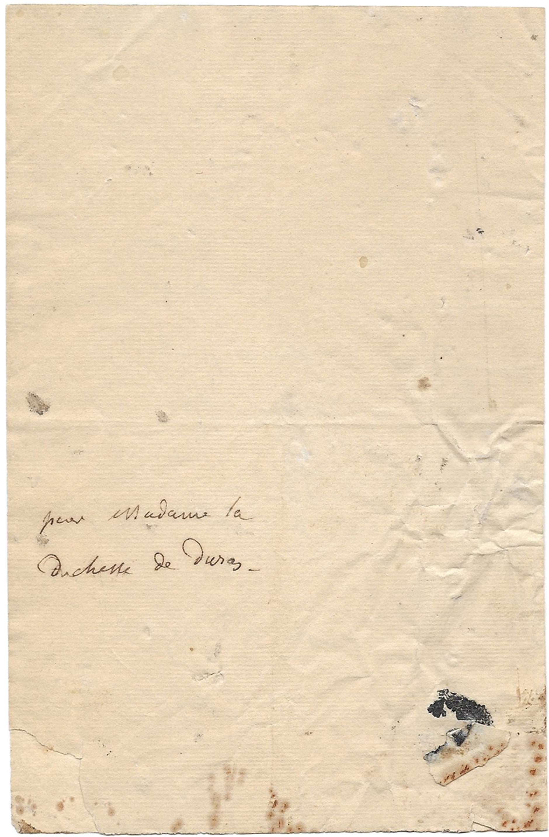 Autograph address on verso [delivered by hand]: « pour Madame la duchesse de duras »