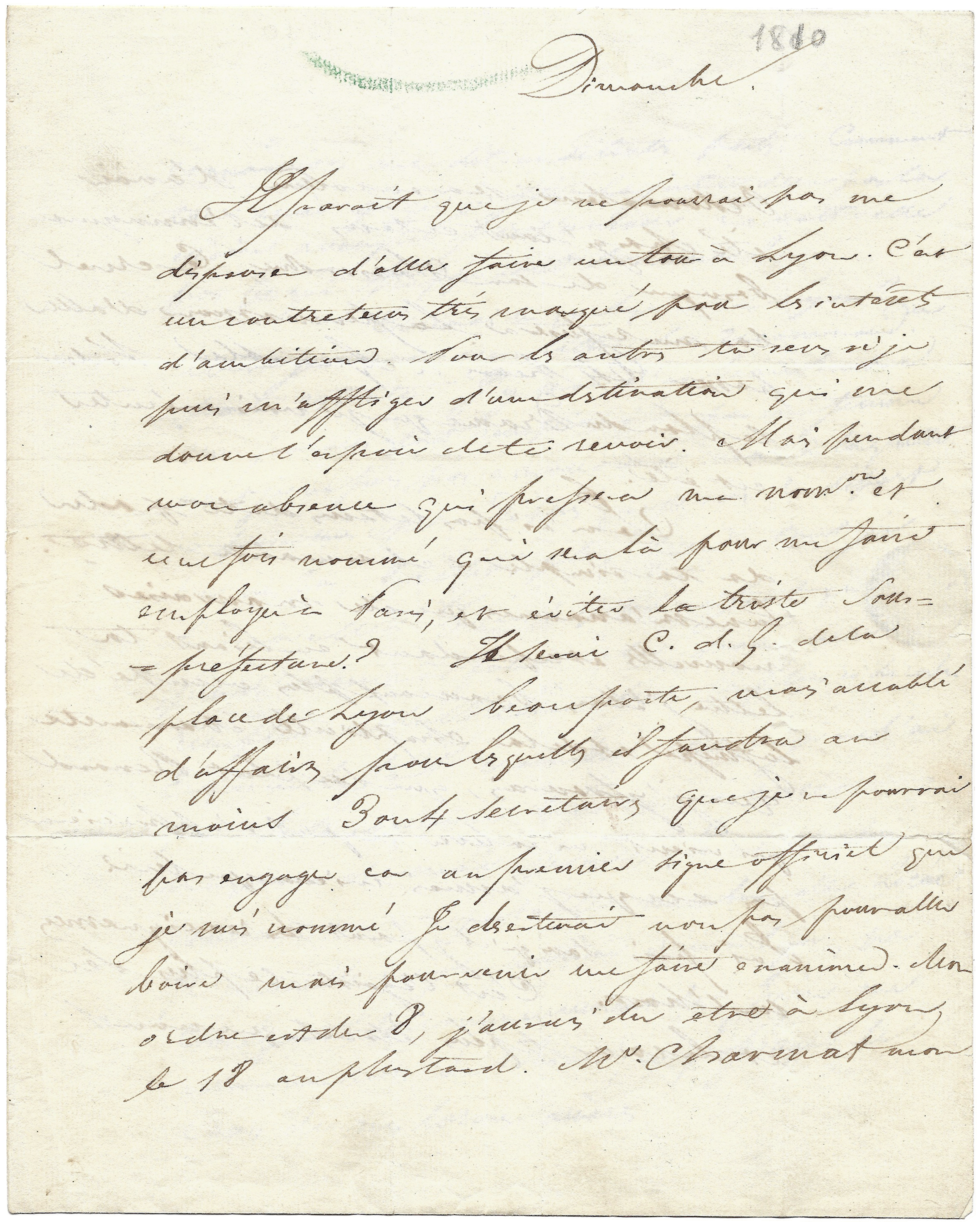 « Il paraît que je ne pourrai pas me dispenser d’aller faire un tour à Lyon. C’est un contre-temps très marqué pour les intérêts d’ambition. Pour les autres, tu sens si je puis m’affliger d’une destination qui me donne l’espoir de te revoir. Mais pendant mon absence, qui pressera ma nom[inati]on et, une fois nommé, qui sera là pour me faire employer à Paris et éviter la triste sous-préfecture ? Je serai C[ommissaire] d[es] G[uerres] de la place de Lyon, beau poste, mais accablé d’affaires pour lesquelles il faudra au moins trois ou quatre secrétaires que je ne pourrai pas engager, car au premier signe officiel que je suis nommé, je déserterai, non pas pour aller boire, mais pour me faire examiner. Mon ordre est du 8, j’aurais dû être à Lyon le 18 au plus tard. M. Charmat, mon ordonnateur, sera en colère d’avoir été chargé tout ce temps de l’ennuyeuse besogne de sous-ordre. Ce cruel-là me refusera la permission d’aller passer vingt-quatre heures à Grenoble. Voilà le plan du drame que je vais exécuter cet été. Je n’ai pas le temps de te parler de ta simple et charmante lettre. Tu ne m’annonces que de mauvaises nouvelles et cependant, en lisant ta lettre, j’étais beaucoup plus occupé de la finesse et de la simplicité charmante que j’y trouvais, que du plat renard qui vient m’enlever ce qu’il n’appréciera pas et ce que j’aimais mieux que lui [allusion au mariage de Victorine Mounier]. J’ai pris, sans qu’il y parût, des renseignements sur l’homme. C’est l’égoïste le plus sec et le cœur le plus étroit que nous connaissions, me dit-on de toutes parts. Comment ton amie, à qui je fais la justice de ne pas la croire aveuglée par l’amour, ne voit-elle pas ce qui frappe tout le monde ?