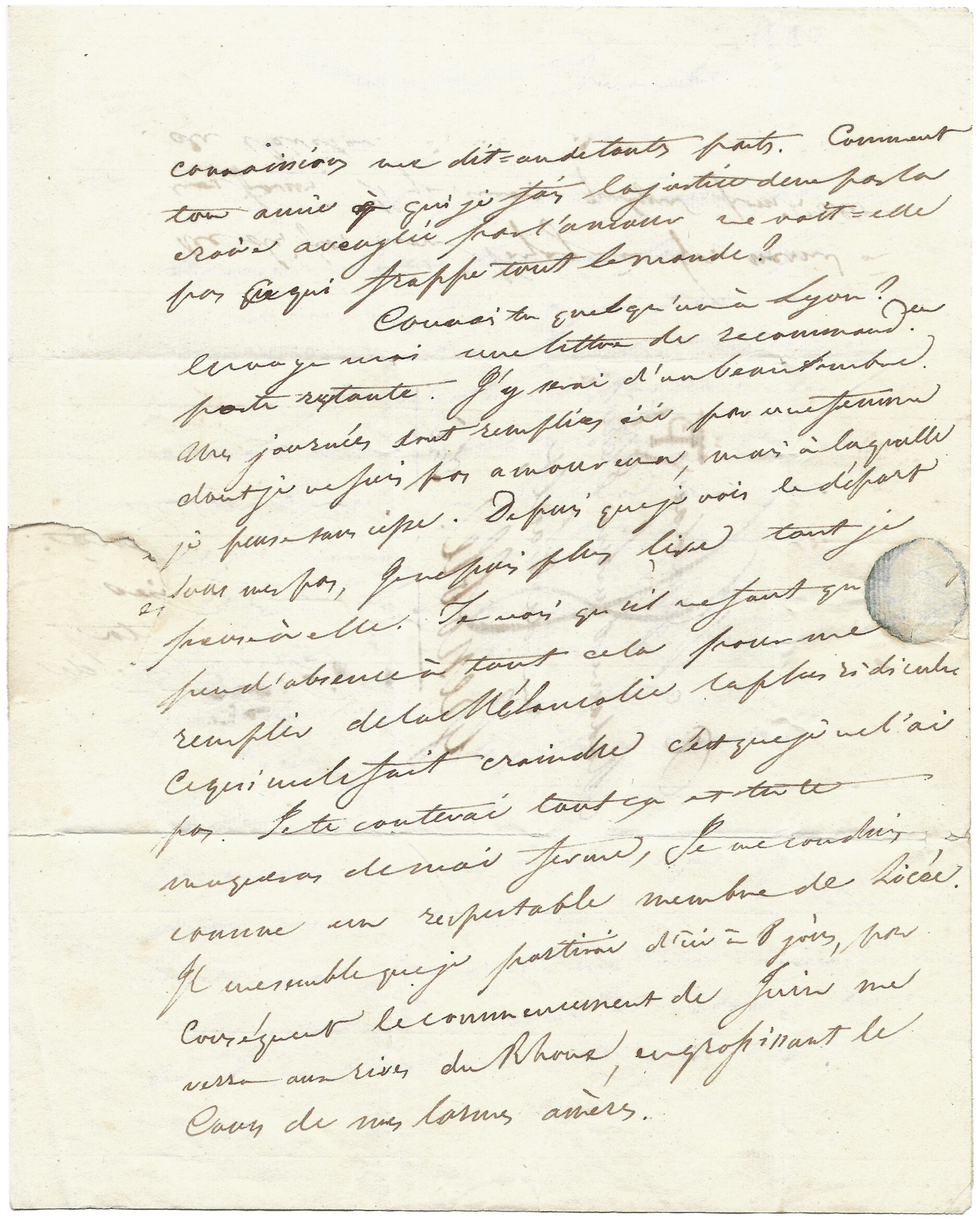 Connais-tu quelqu’un à Lyon ? Envoie-moi une lettre de recommand[ati]on poste restante. J’y serai d’un beau sombre. Mes journées sont remplies ici par une femme, dont je ne suis pas amoureux, mais à laquelle je pense sans cesse. Depuis que je vois le départ sous mes pas, je ne puis plus lire, tant je pense à elle. Je crois qu’il ne faut qu’un peu d’absence à tout cela pour me remplir de la mélancolie la plus ridicule. Ce qui me le fait craindre, c’est que je ne l’ai pas. Je te conterai tout ça et tu te moqueras de moi ferme. Je me conduis comme un respectable membre de Lycée. Il me semble que je partirai d’ici à huit jours, par conséquent le commencement de juin me verra aux rives du Rhône, en grossissant le cours de mes larmes amères.