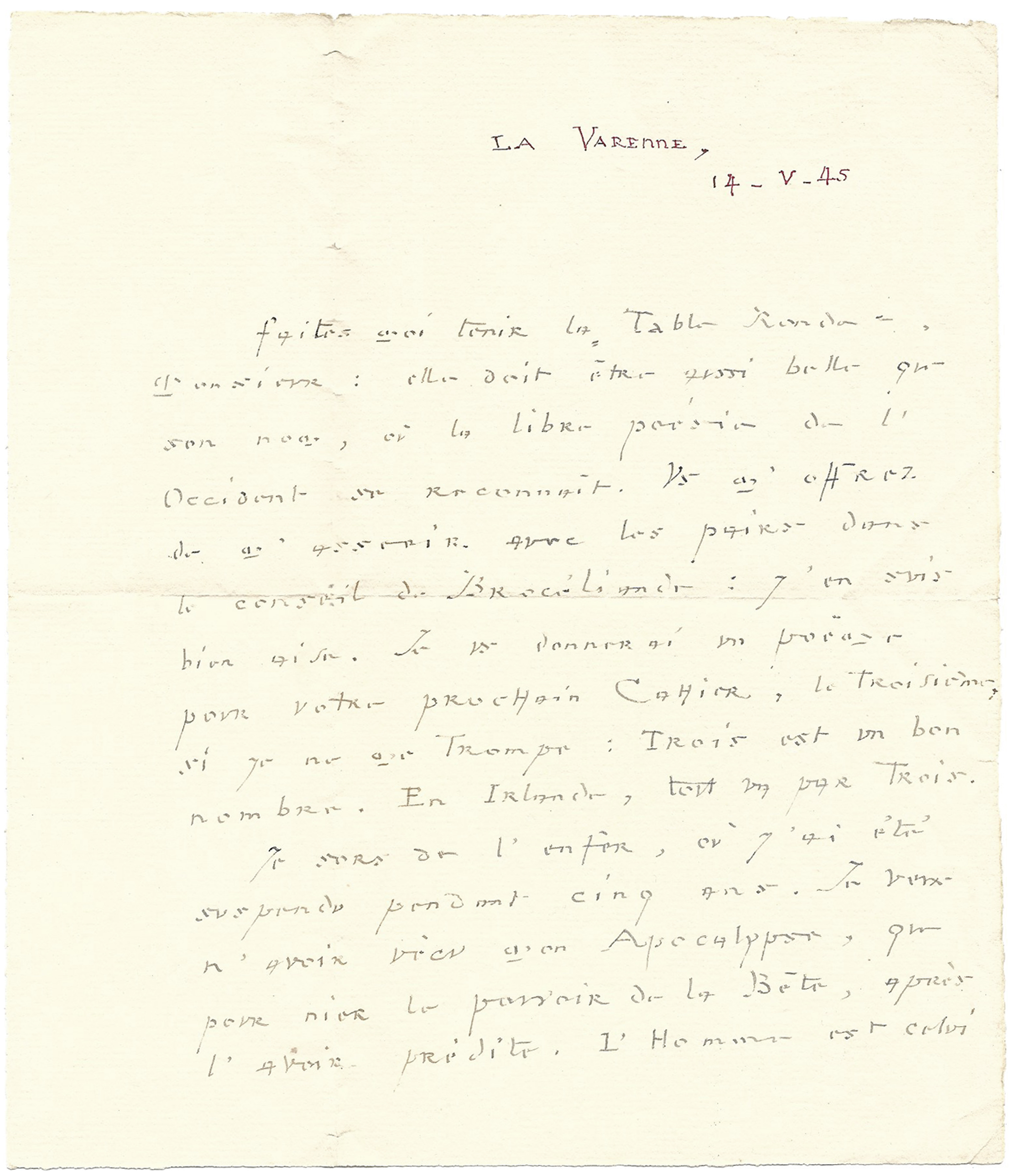 La Varenne, 14th May [19]45, 2 p. in-8°