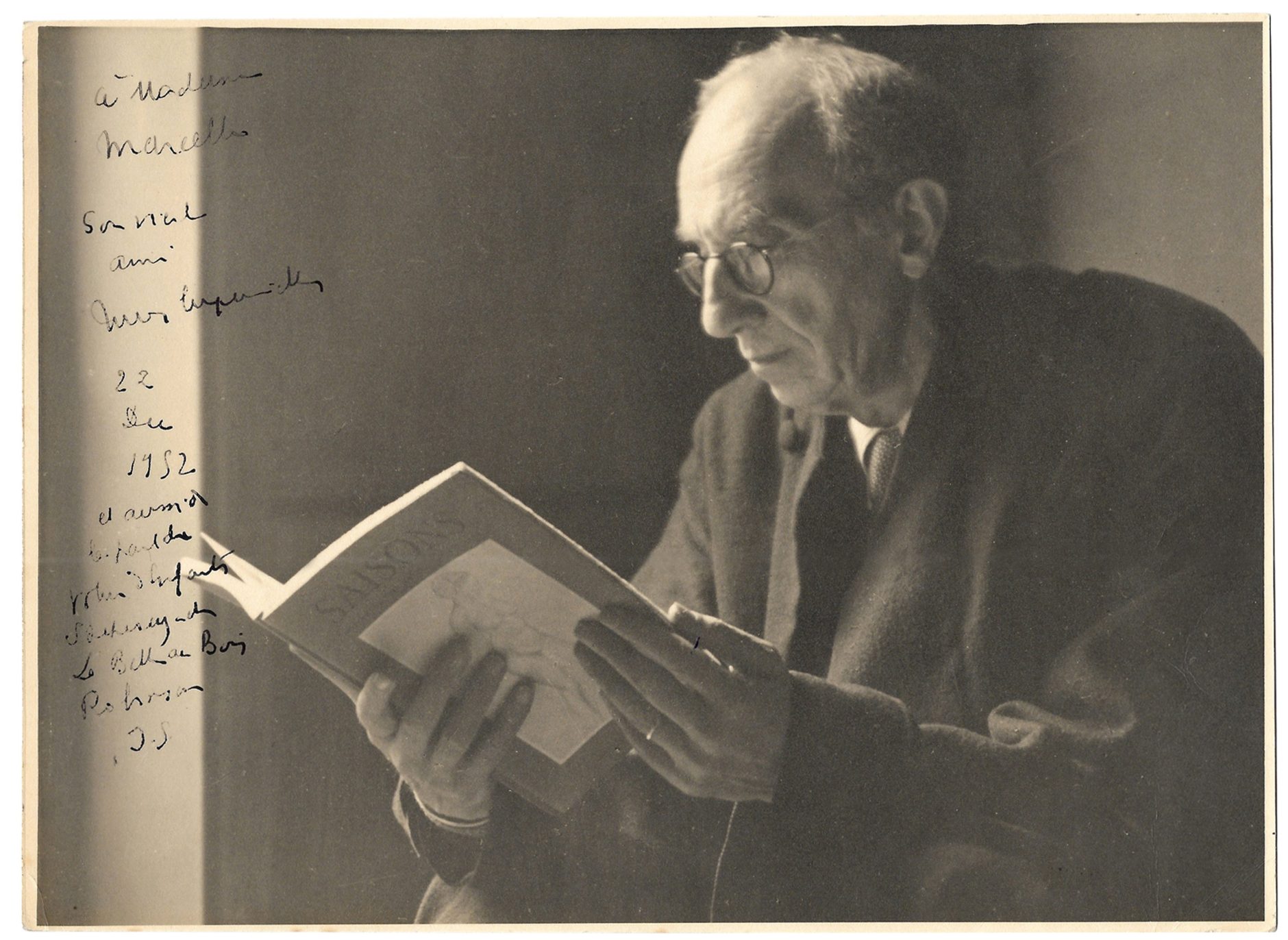 In this elegantly contrasted portrait, the novelist appears dressed in a wide jacket, reading the magazine Saisons.
