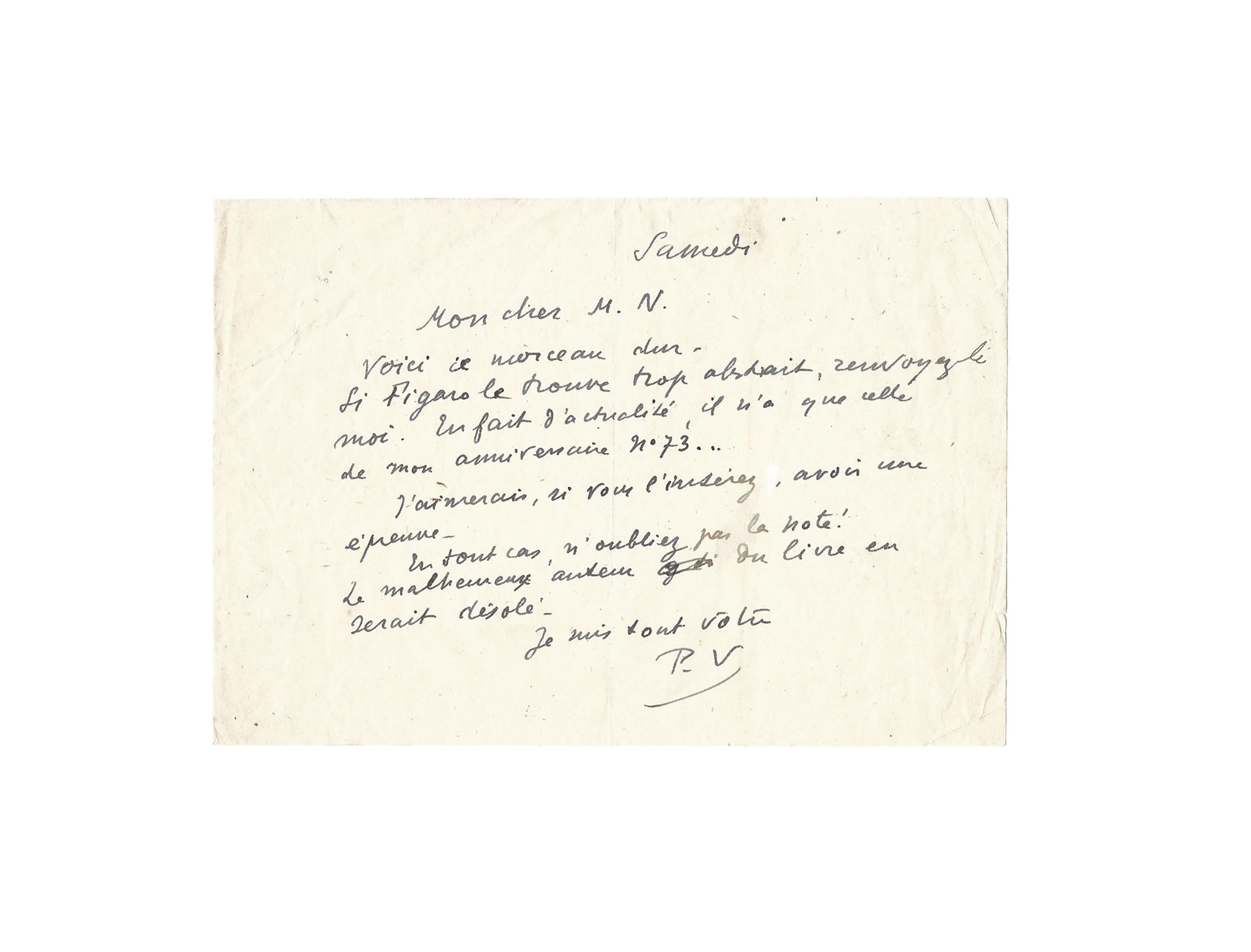Autograph letter signed « P.V » [à Maurice Noël]