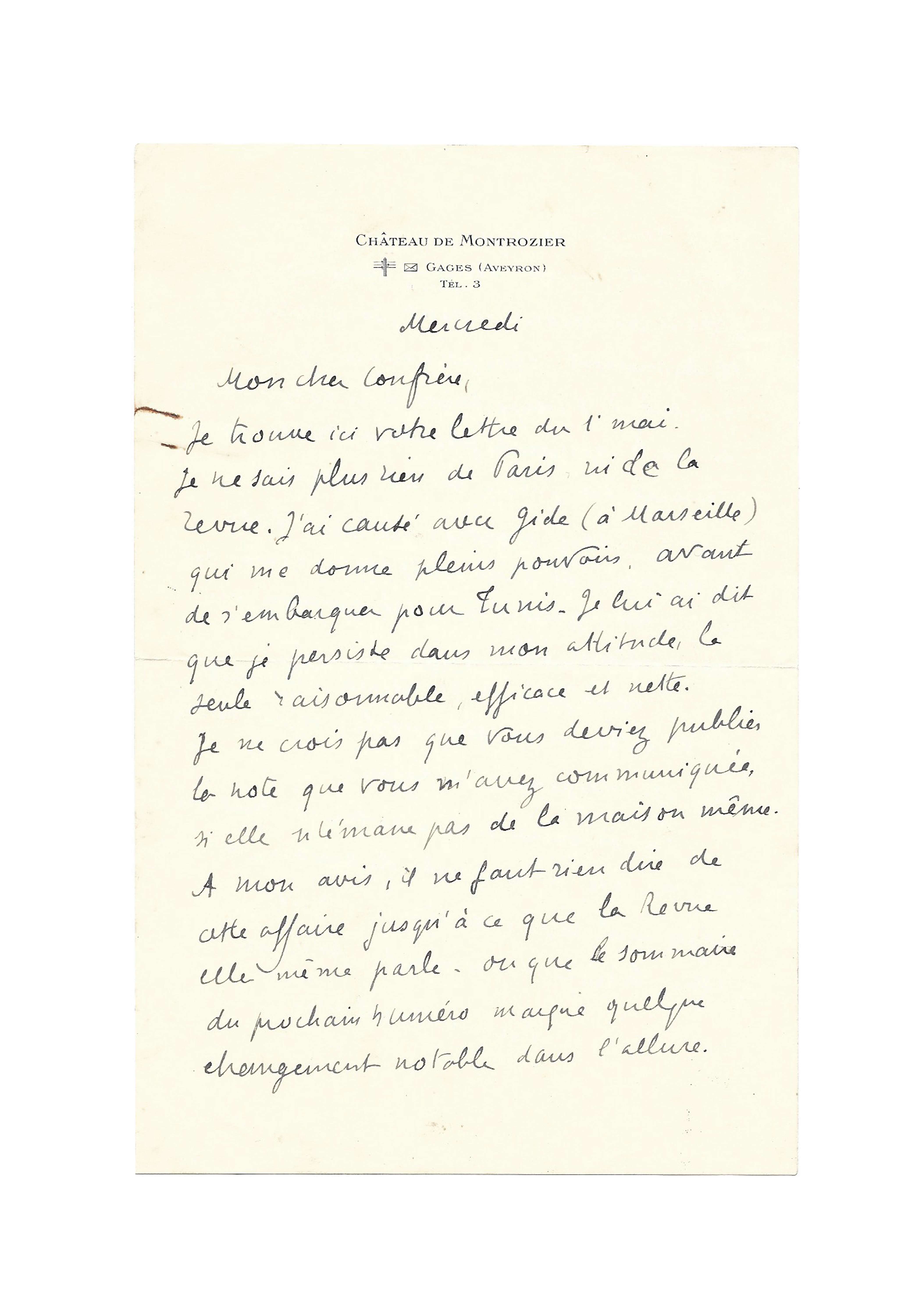Je trouve ici votre lettre du 1er mai. Je ne sais plus rien de Paris, ni de la revue. J’ai causé avec Gide (à Marseille) qui me donne plein pouvoirs, avant de s’embarquer pour Tunis. Je lui ai dit que je persiste dans mon attitude, la seule raisonnable, efficace et nette.