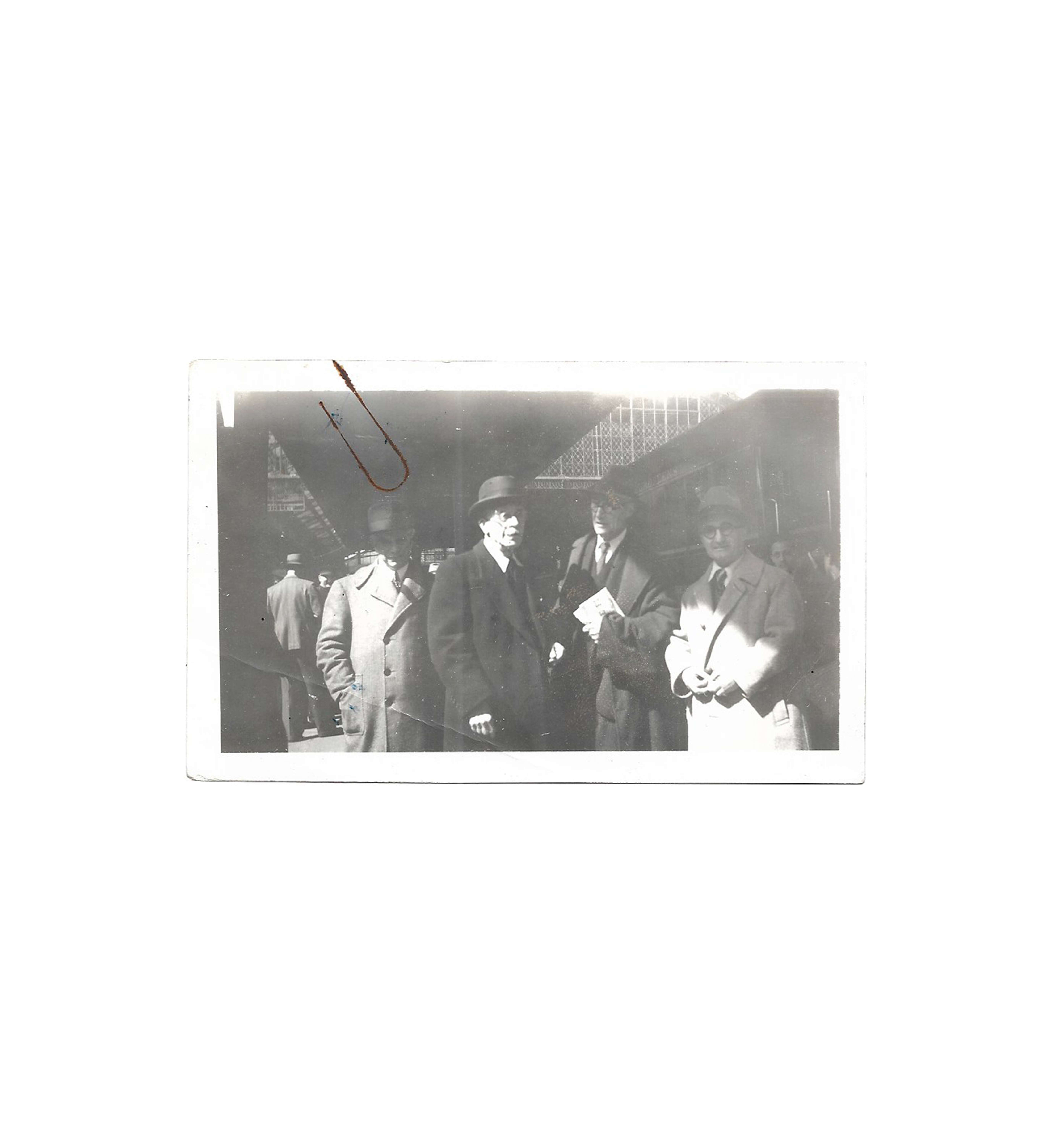 A period film print (11,5 x 7,3 cm) showing Paul Valéry, André Gide et Jean Ballard at the Marseilles train station