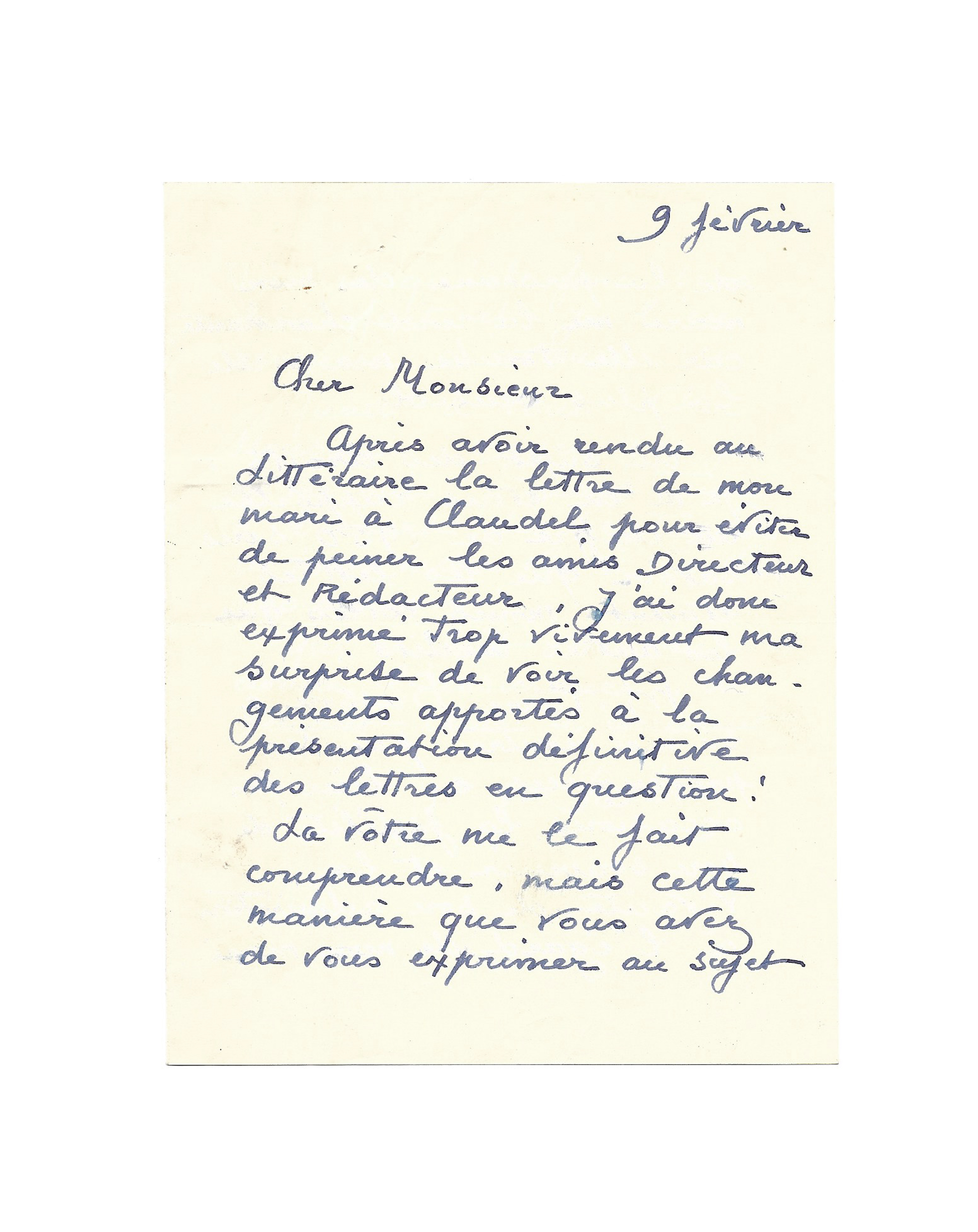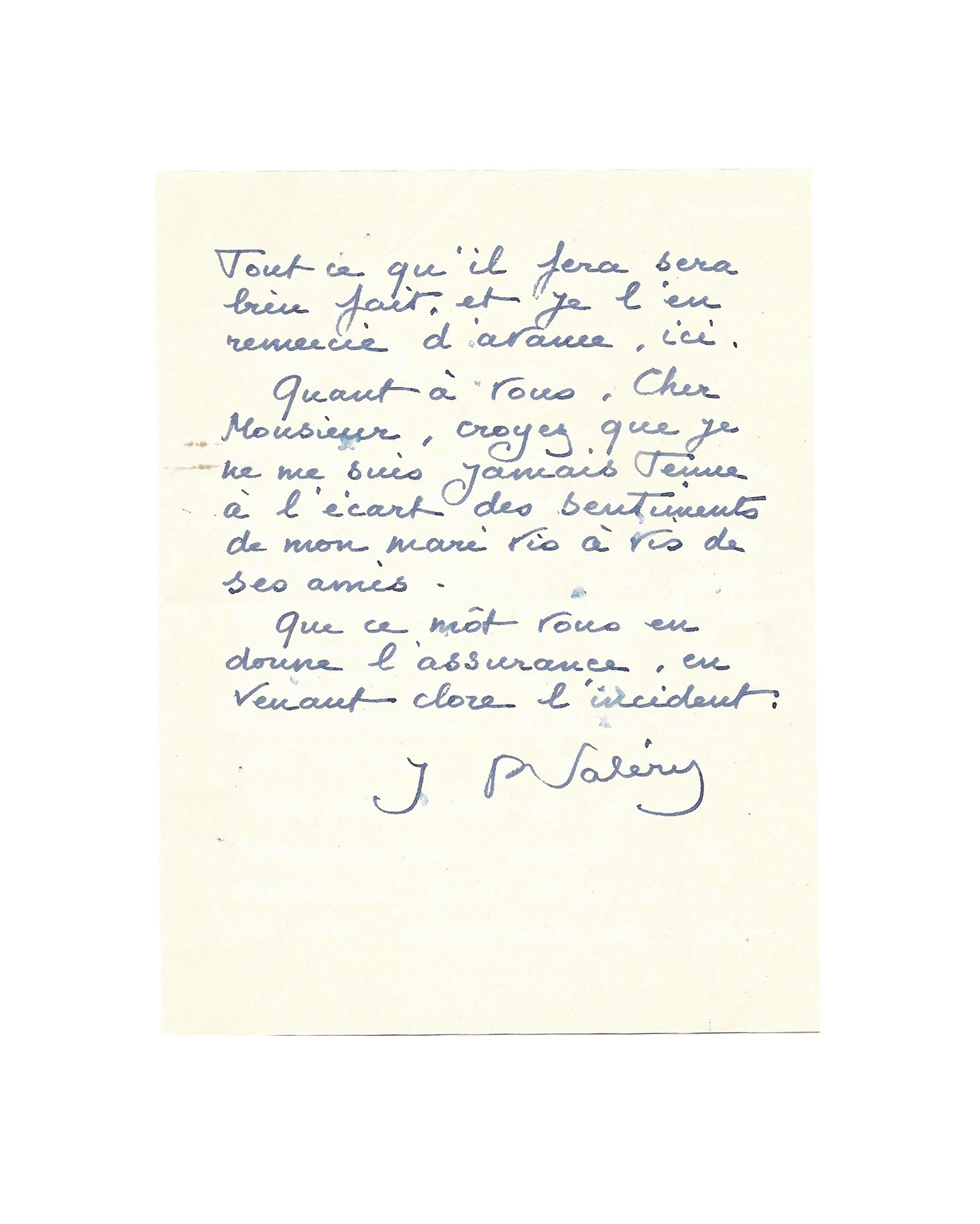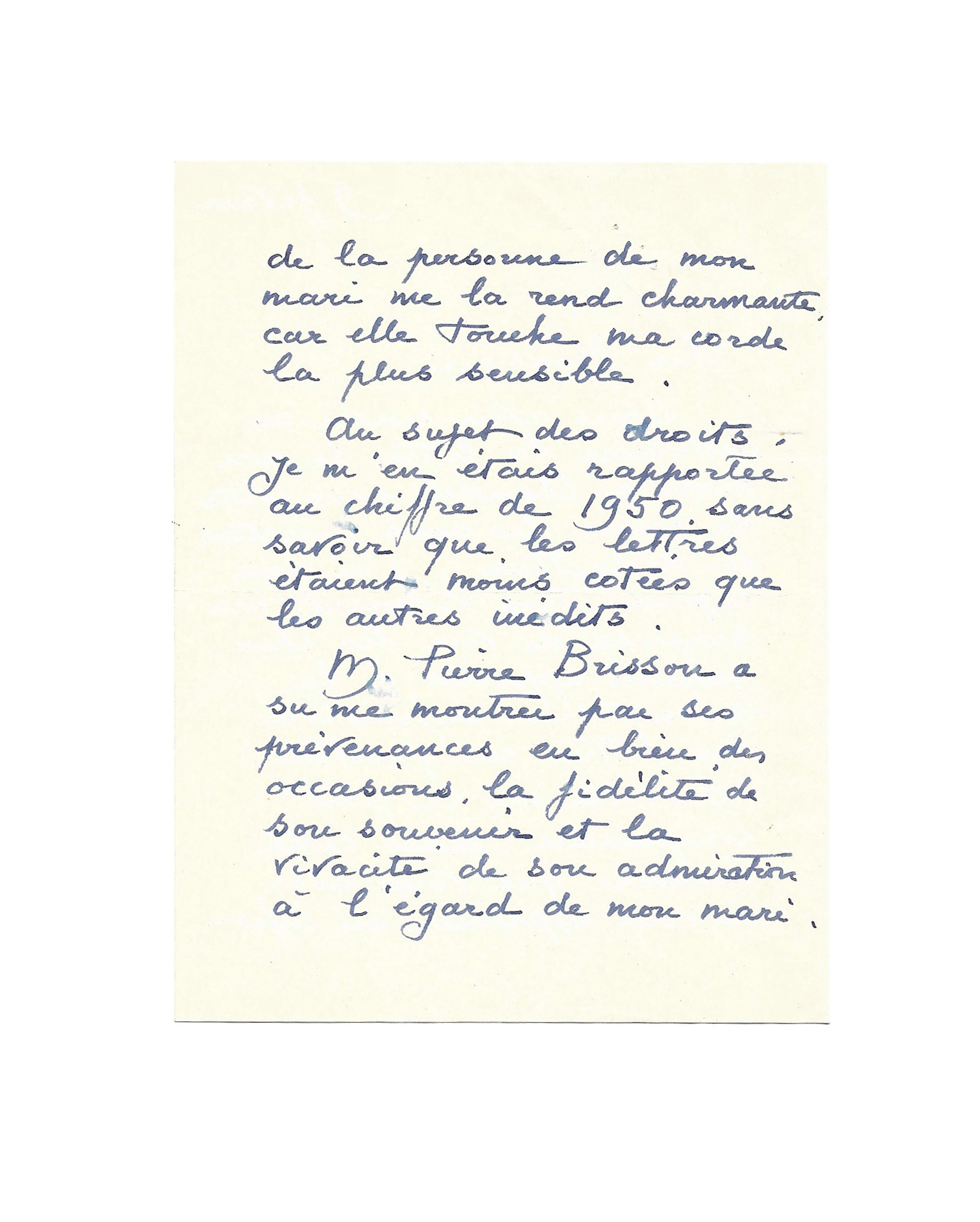 « Après avoir rendu au Littéraire la lettre de mon mari à [Paul] Claudel pour éviter de peiner les amis Directeur et Rédacteur […] cette manière que vous avez de vous exprimer au sujet de la personne de mon mari me la rend charmante, car elle touche à ma corde la plus sensible […] Monsieur Pierre Brisson a su me montrer par ses prévenances en bien des occasions, la fidélité de son souvenir et la vivacité de son admiration à l’égard de mon mari […] J P Valéry »