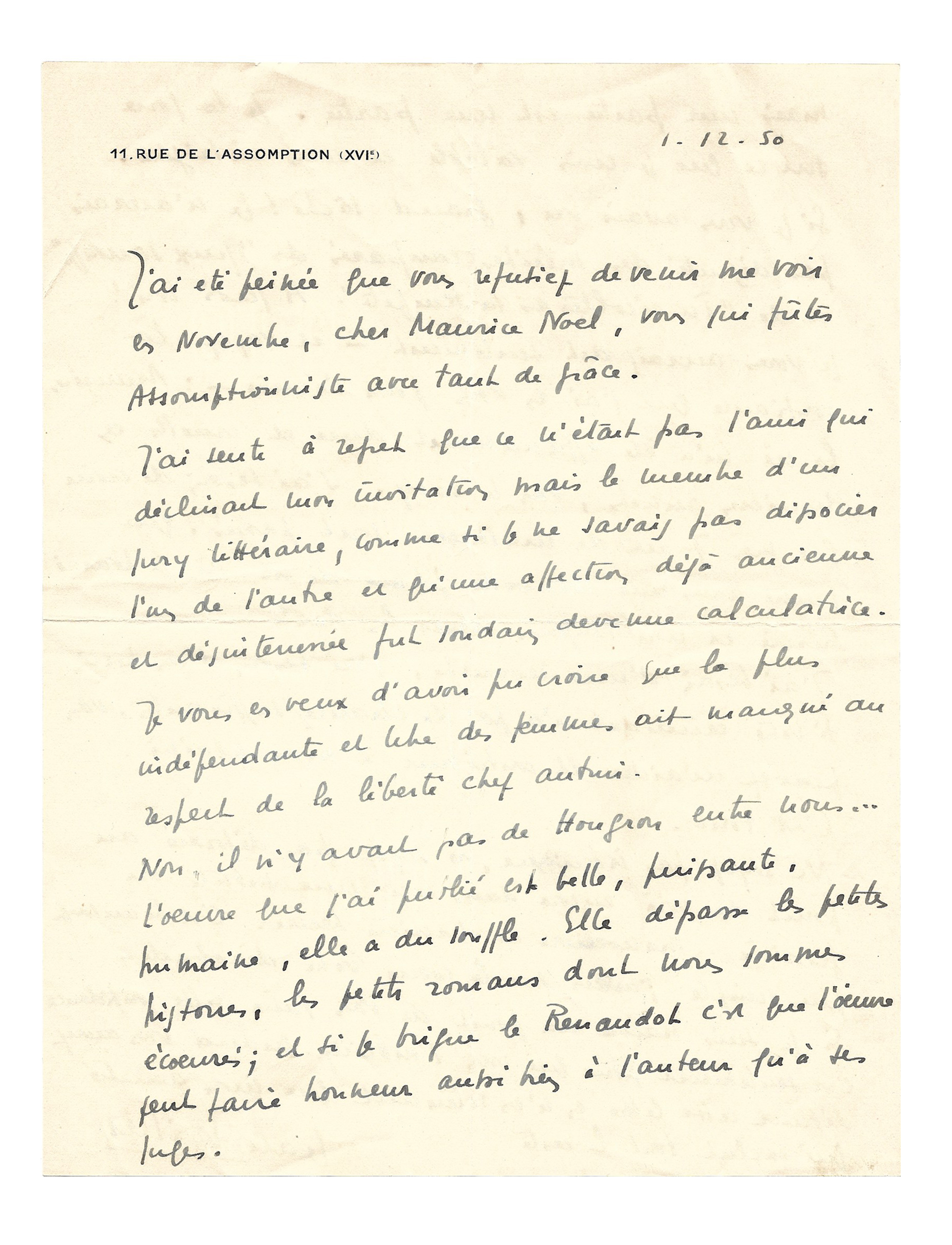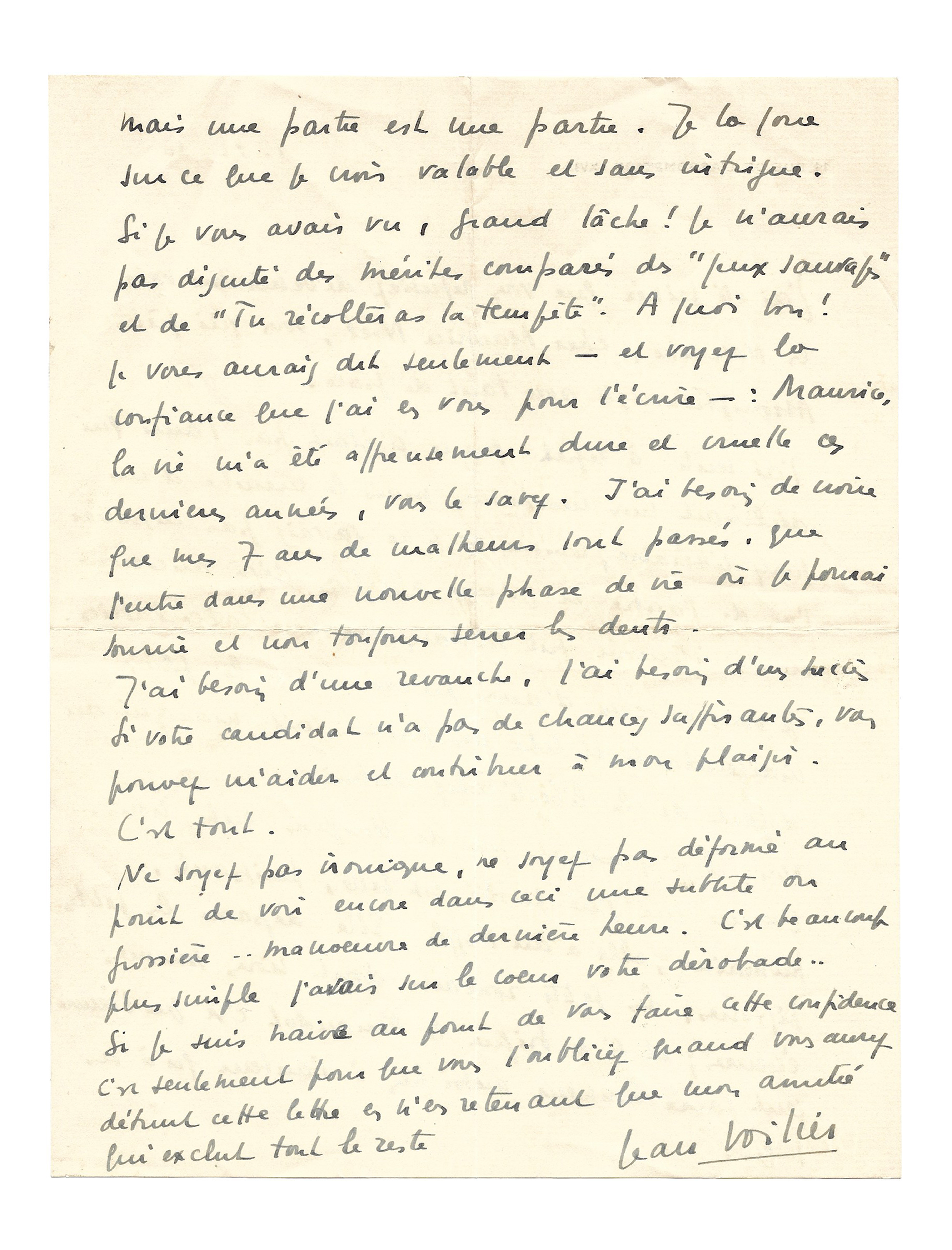 « Je vous en veux d’avoir pu croire que la plus indépendant et livre des femmes ait manqué au respect de la liberté chez autrui […] L’œuvre que j’ai publié est belle, puissante, humaine, elle a du souffle. Elle dépasse les petites histoires, les petits romans dont nous sommes écœurés […] Maurice, la vie m’a été affreusement dure et cruelle ces dernières années [allusion à la mort de Paul Valéry et l’assassinat de l’éditeur Robert Denoël, dont elle était la maîtresse au moment de la tragédie et publiquement accusée d’en avoir été la commanditaire], vous le savez […] J’ai besoin d’une revanche, j’ai besoin d’un succès. Si vôtre candidat [allusion à sa demande de candidature au prix Renaudot] n’a pas de chances suffisantes, vous pouvez m’aider et continuer à mon plaisir. C’est tout. […] Si je suis naïve au point de vous faire cette confiance c’est seulement pour que vous l’oubliez quand vous aurez détruit cette lettre en n’en retenant que mon amitié qui exclut tout le reste, Jean Voilier »