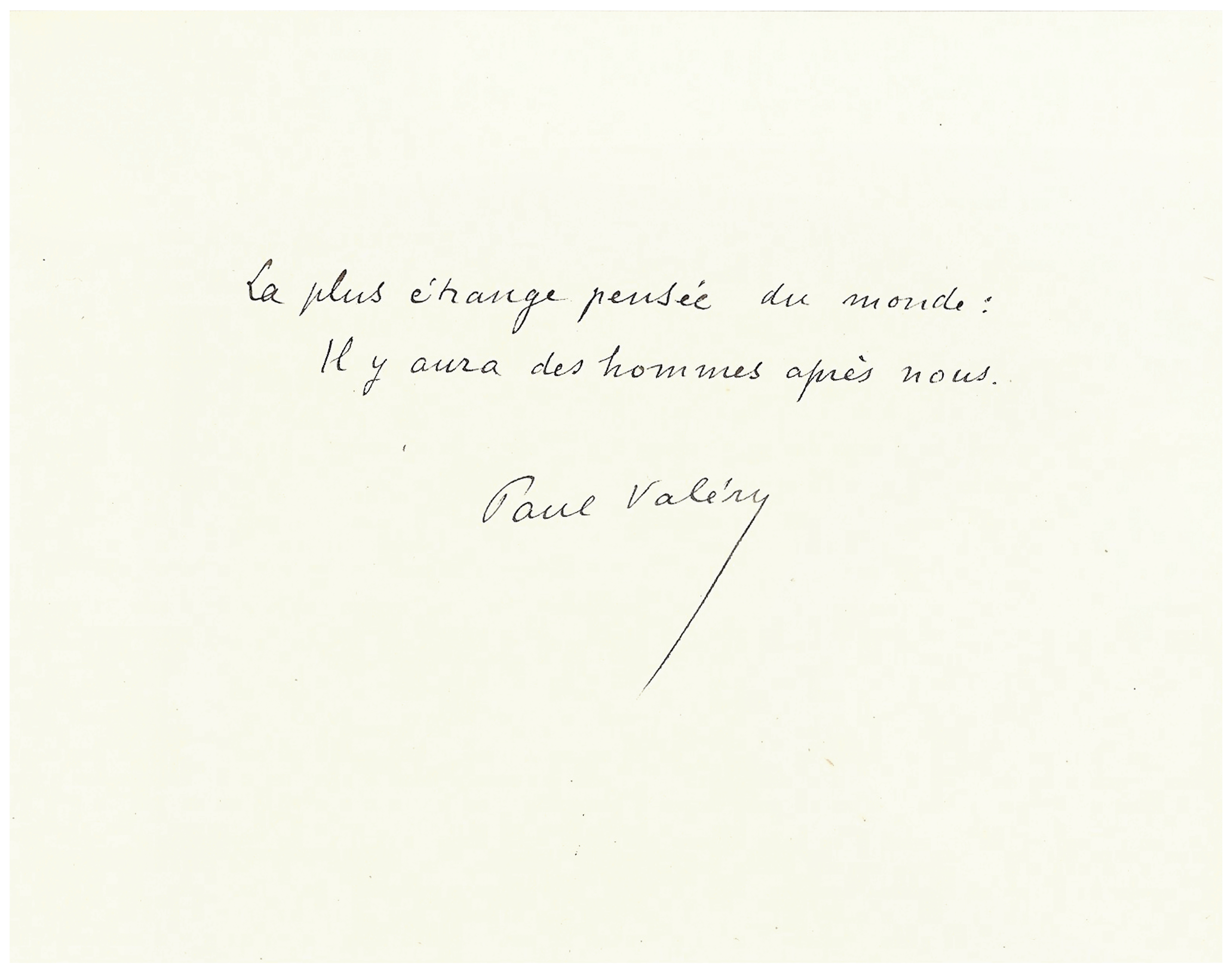 The poet composed this sentence at the request of his friend and volunteer secretary Julien-Pierre Monod, who wanted to have it sealed on a bench on his property in Anthy. Valéry sent the sentence to Monod on a “little piece of paper” on August 18, 1930, and copied it elsewhere in his Notebooks: “I am sending to Monod, who is requesting a sentence to be sealed on his bench in Anthy, this: / This is the strangest thought in the world: / ‘There will be men after us.'” Valéry published a first variation of this reflection that same year in the December 10 issue of La Muse française dedicated to him: “Hear the strangest words: / There will be men after us.”