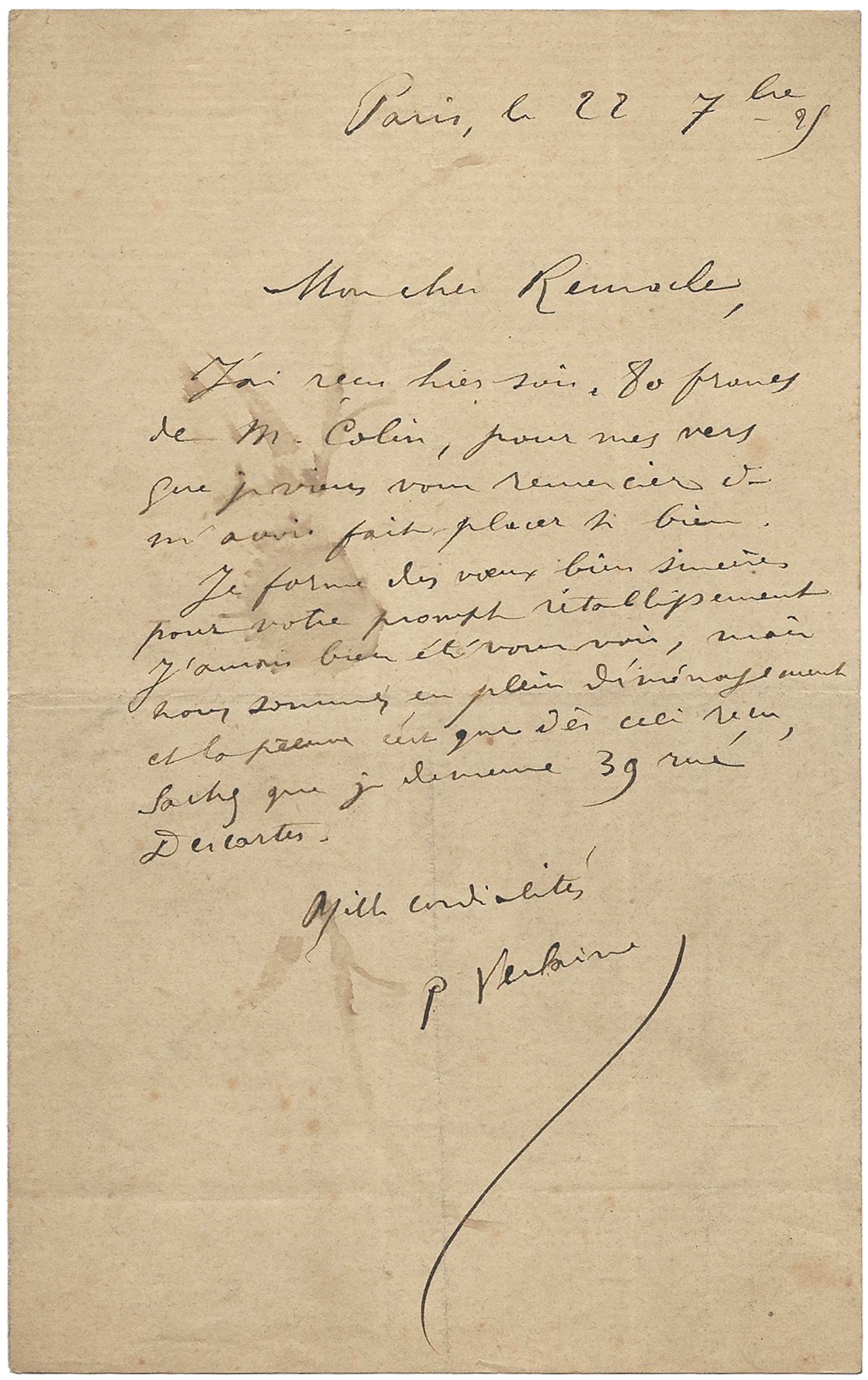 In feverish writing, Verlaine gives his last address at 39 rue Descartes, where he would pass away three and a half months later