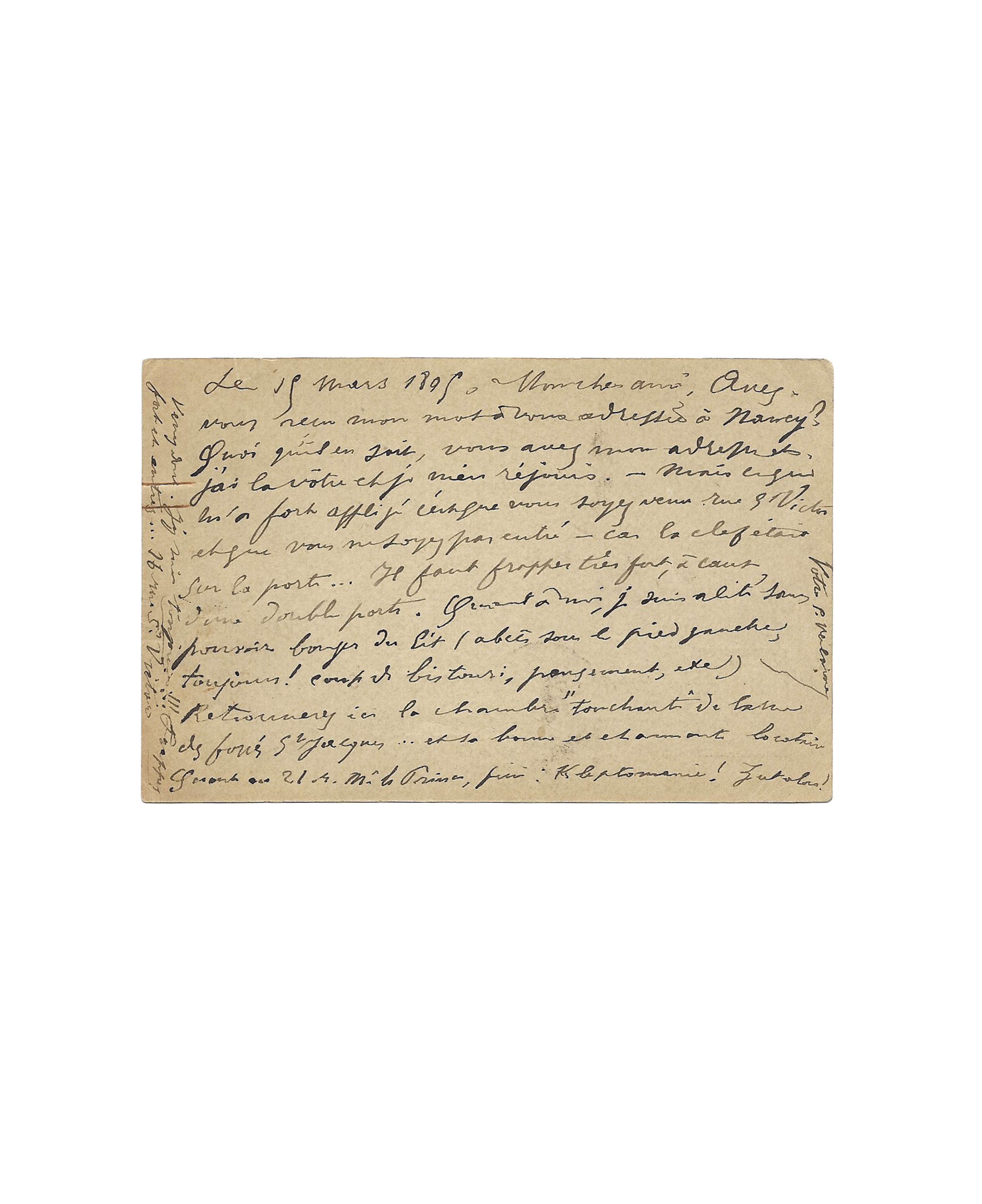 « Mon cher ami, Avez-vous reçu mon mot à vous adressé à Nancy ? Quoi qu’il en soit, vous avez mon adresse. J’ai la vôtre et je m’en réjouis. – Mais ce qui m’a fort affligé c’est que vous soyez venu rue St Victor et que vous ne soyez pas entré – car la clef était sur la porte… Il faut frapper très fort, à cause d’une double porte. Quant à moi, je suis alité sans pouvoir bouger du lit (abcès sous le pied gauche, toujours ! coup de bistouri, pansement, etc.)