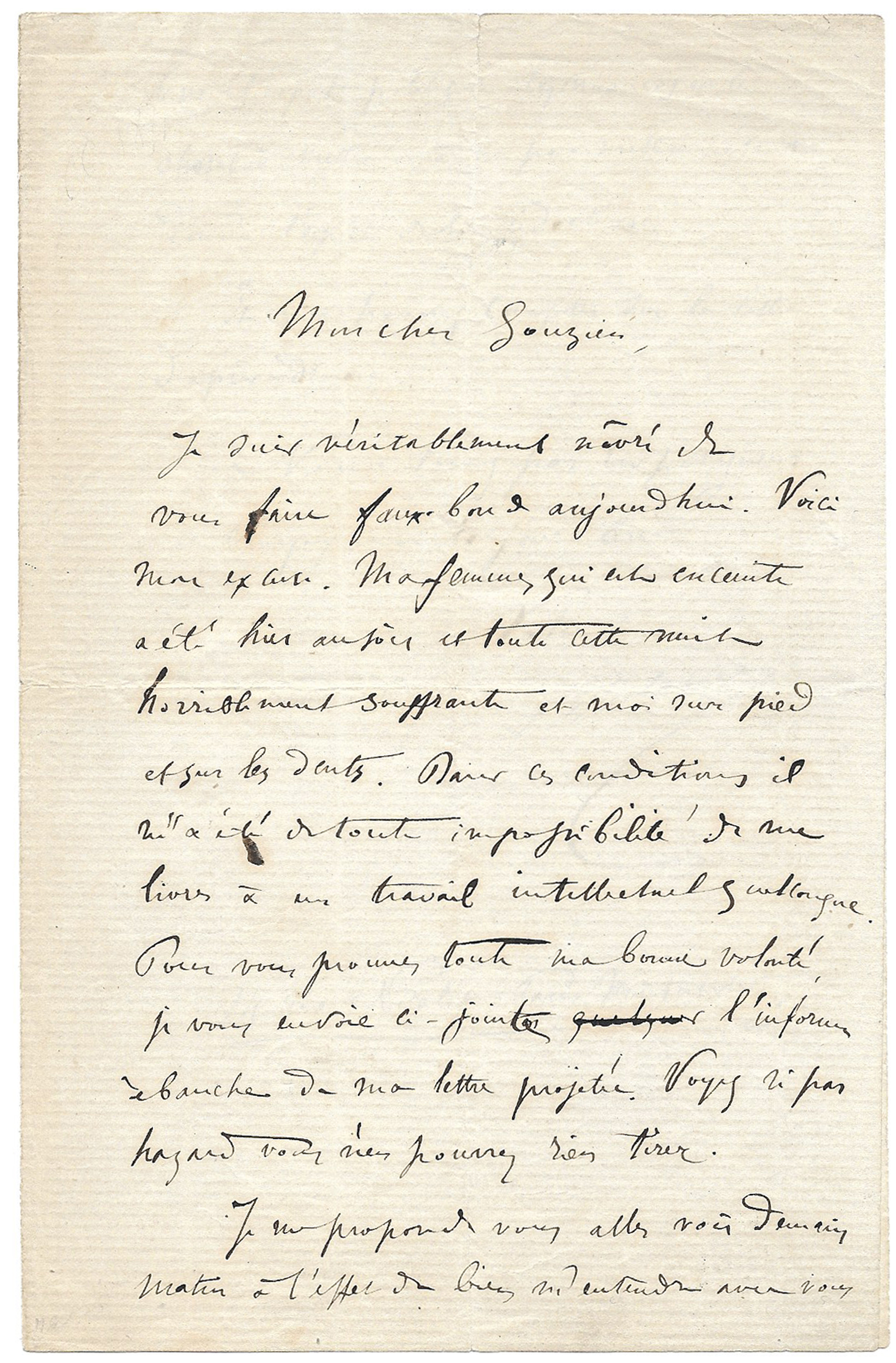 Je suis véritablement navré de vous faire faux-bond aujourd’hui. Voici mon excuse. Ma femme qui est enceinte a été hier au soir et toute cette nuit horriblement souffrante et moi sur pied et sur les dents. Dans ces conditions il m’a été de toute impossibilité de me livrer à un travail intellectuel quelconque. Pour vous prouver toute ma bonne volonté, je vous envoie ci-jointe quelques l’informe ébauche de ma lettre projetée. Voyez si par hasard vous n’en pourriez rien tirer.