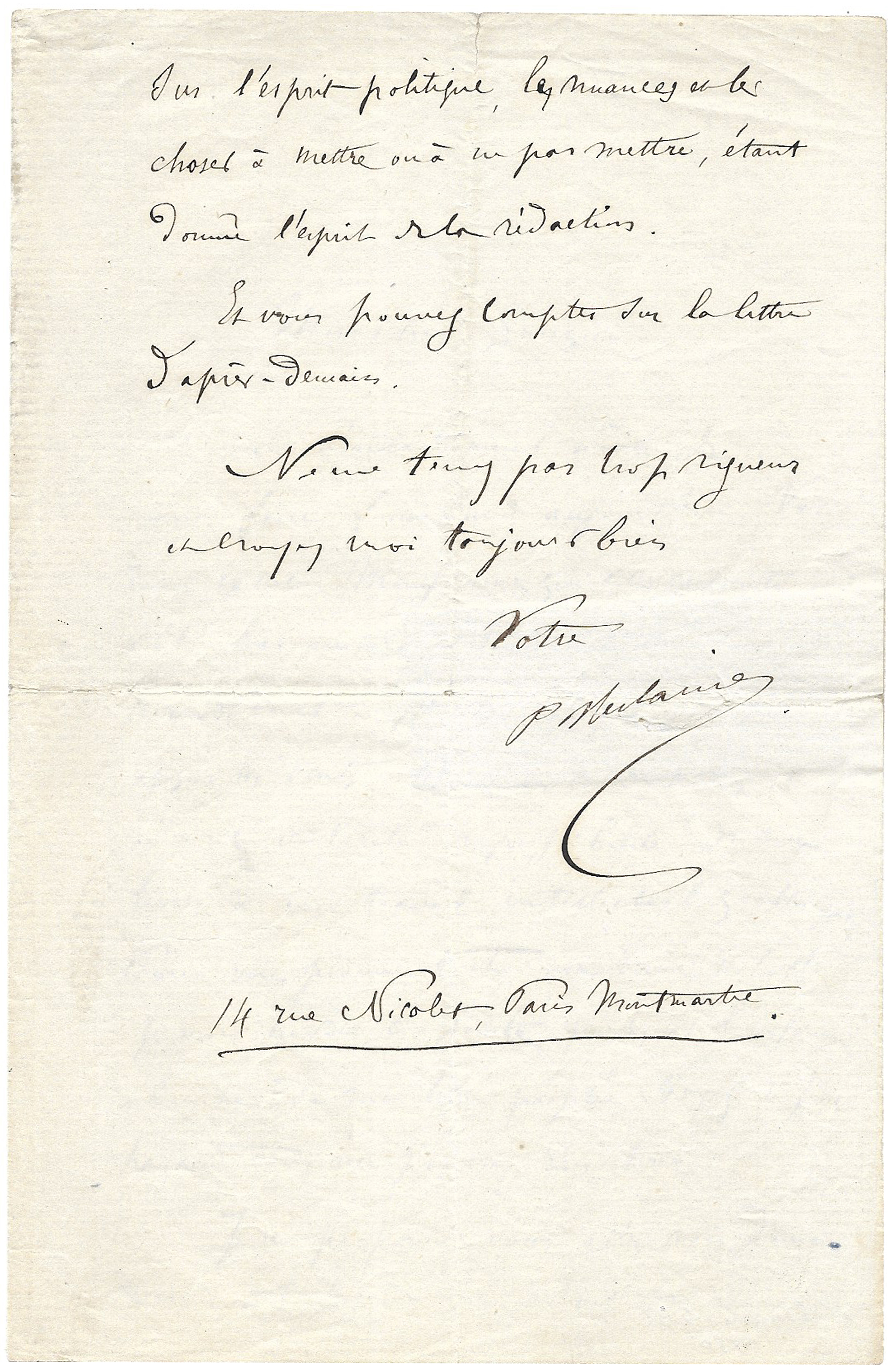 Paris-Montmartre, [September-October 1871], 2 p. in-8° in black ink on laid paper