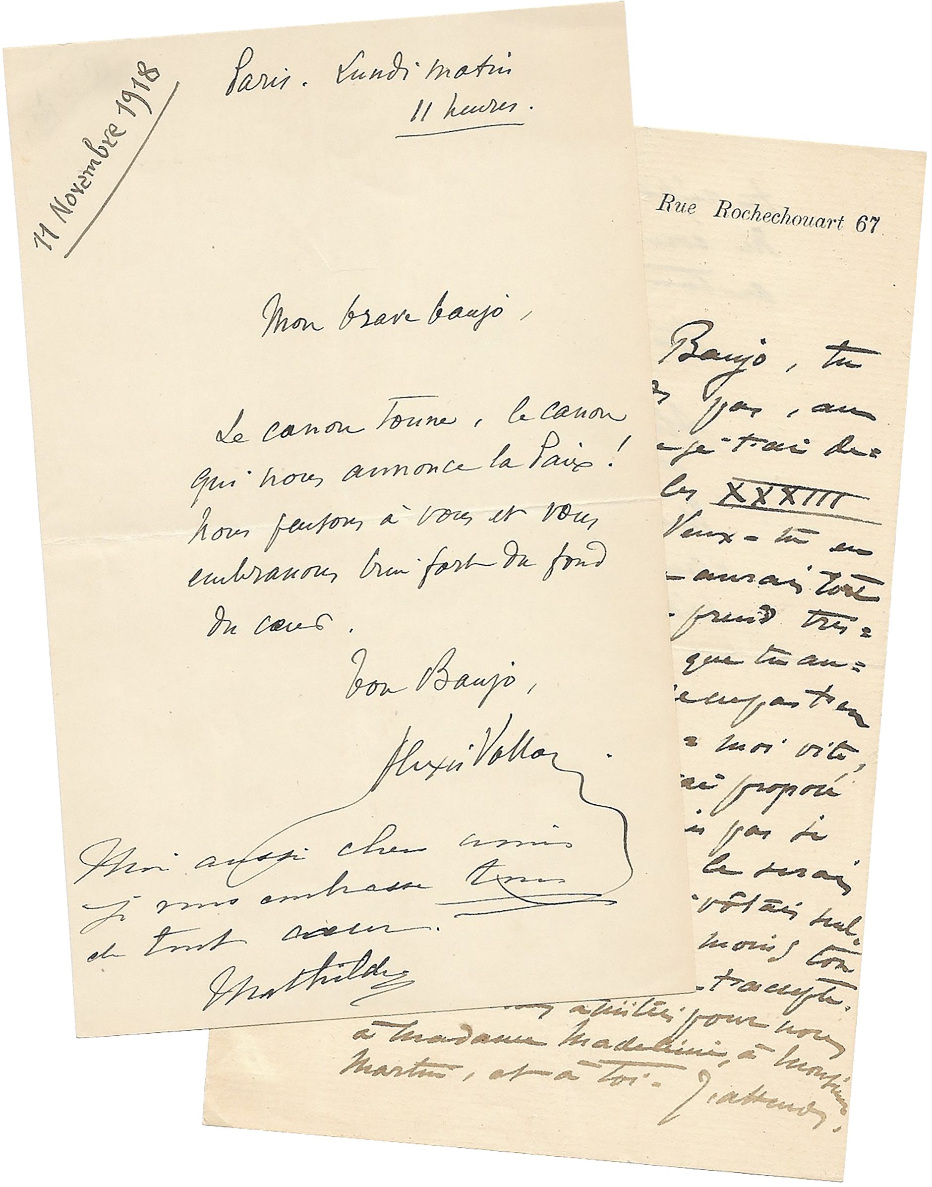 Two other autograph letters (3 pp. in-8° in total) from Vollon to Martin, alias “Banjo”; one concerning the Société des XXXIII, the other written on the day of the Armistice, November 11, 1918.