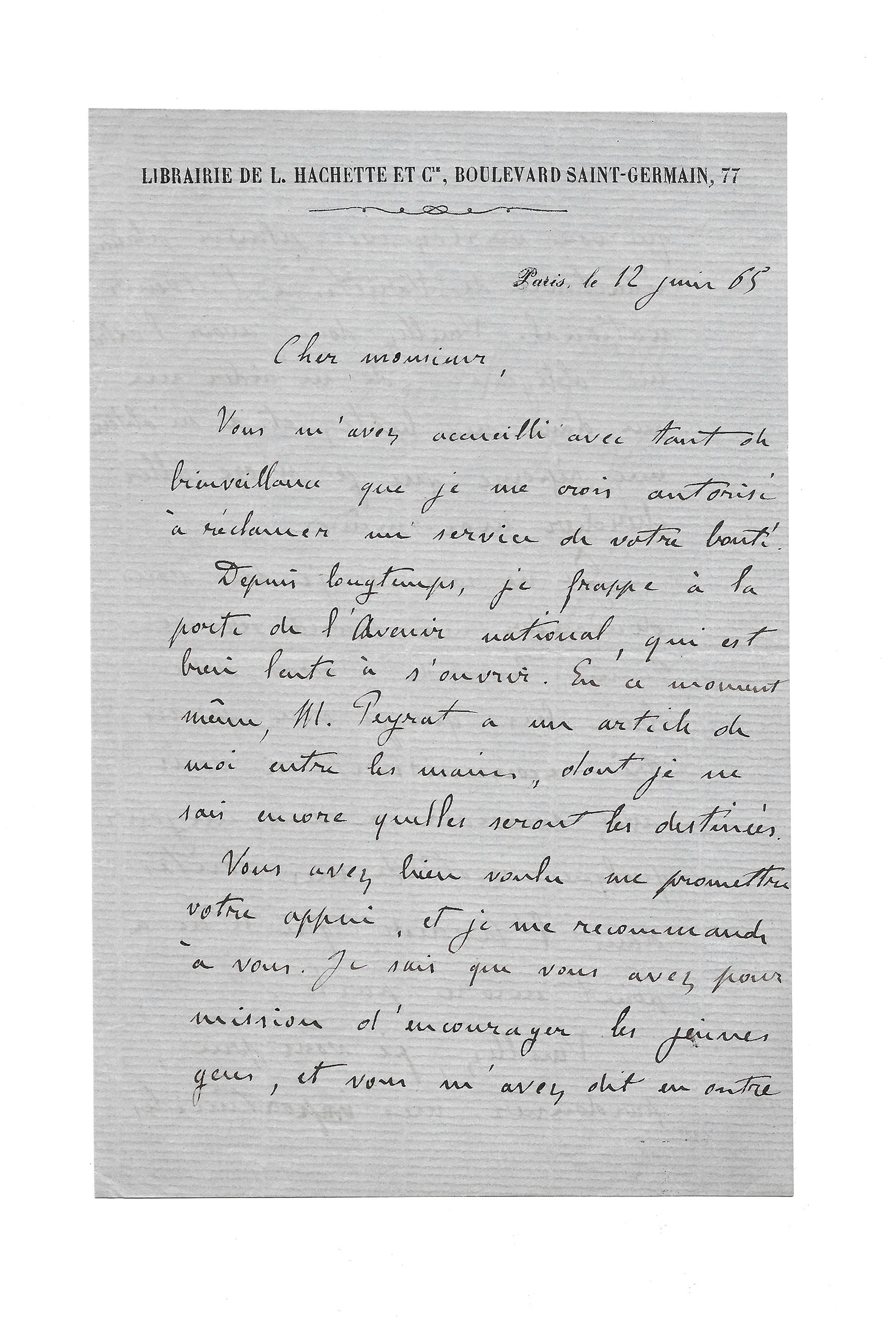 Paris, 12th June 1865, 2 p. 1/2  in-8, Librairie Hachette & Cie letterhead