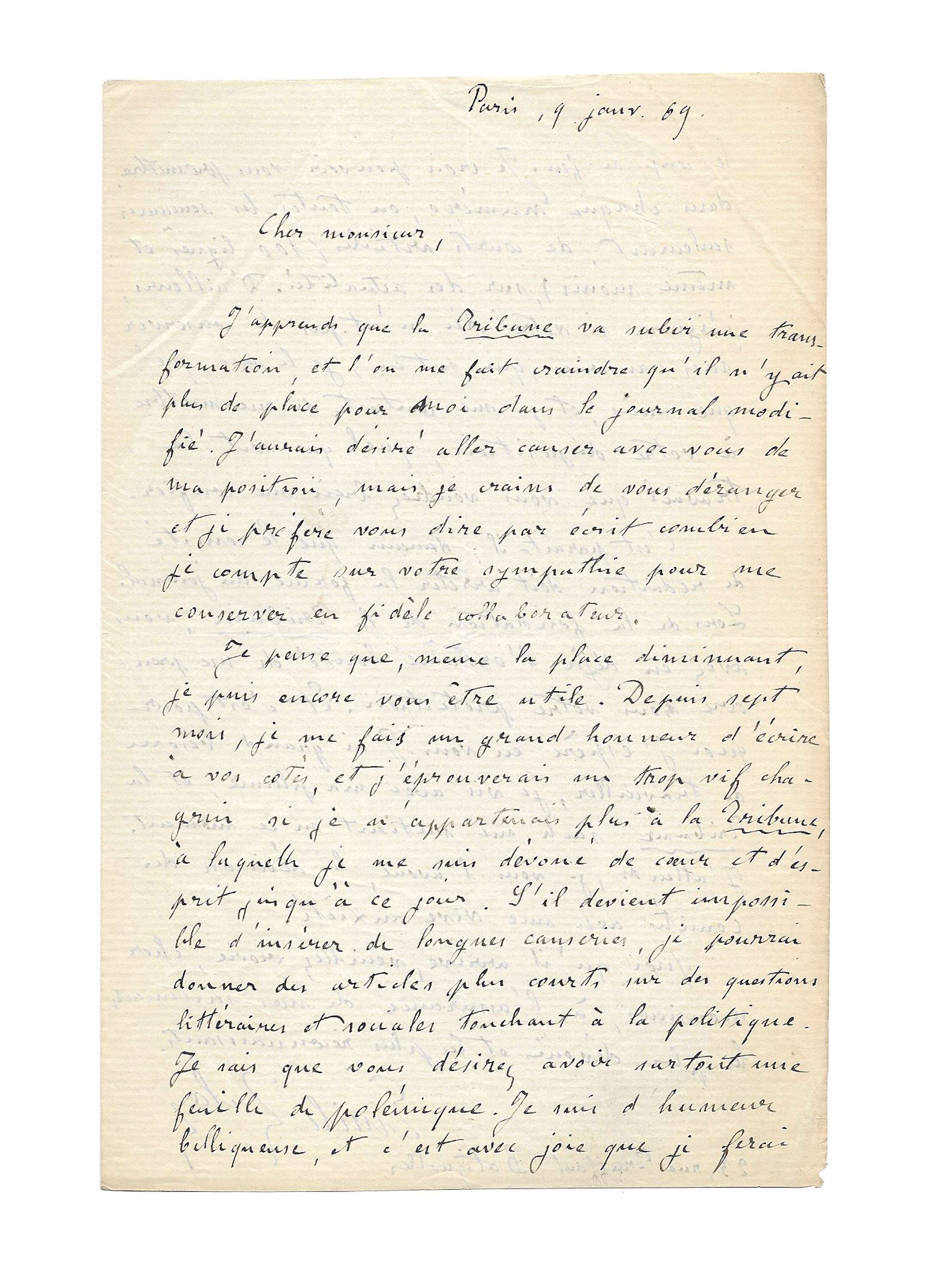 « J’apprends que la Tribune va subir une transformation, et l’on me fait craindre qu’il n’y ait plus de place pour moi dans le journal modifié. J’aurais désiré aller causer avec vous de ma position, mais je crains de vous déranger et je préfère vous dire par écrit combien je compte sur votre sympathie pour me conserver en fidèle collaborateur. Je pense que, même la place diminuant, je puis encore vous être utile. Depuis sept mois, je me fais un grand honneur d’écrire à vos côtés, et j’éprouverais un trop vif chagrin si je n’appartenais plus à la Tribune, à laquelle je me suis dévoué de coeur et d’esprit jusqu’à ce jour. S’il devient impossible d’insérer de longues causeries, je pourrai donner des articles plus courts, sur des questions littéraires et sociales touchant à la politique.