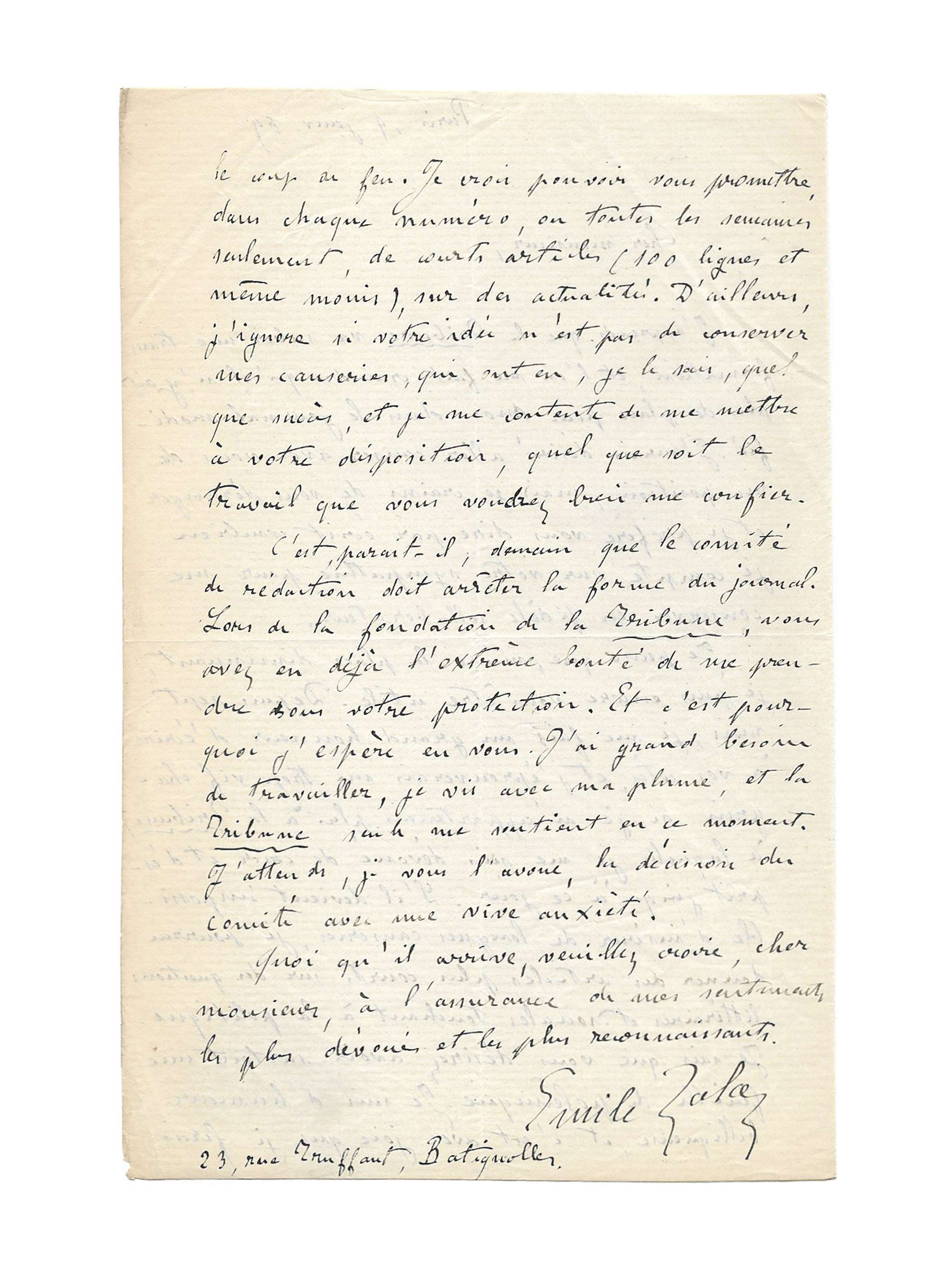 Beautiful plea of young Emile Zola, ready to all editorial concessions in order to remain columnist of the newspaper La Tribune