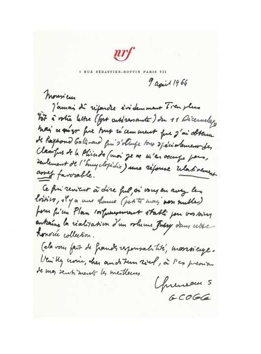 N.p, 9th August 1964, 1 p. in 8vo, NRF letterhead