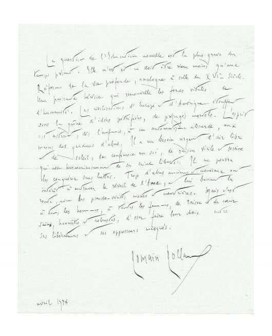 Autograph letter signed « Romain Rolland » to Louis Chazai