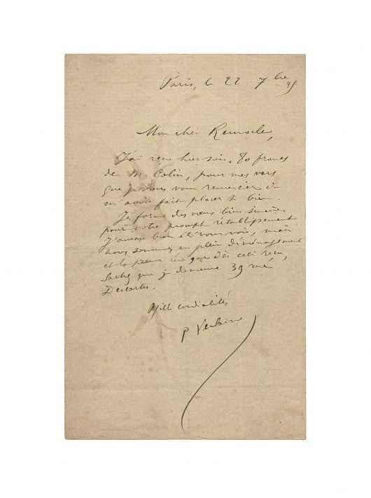 Autograph letter signed « P Verlaine » to Adrien Remacle