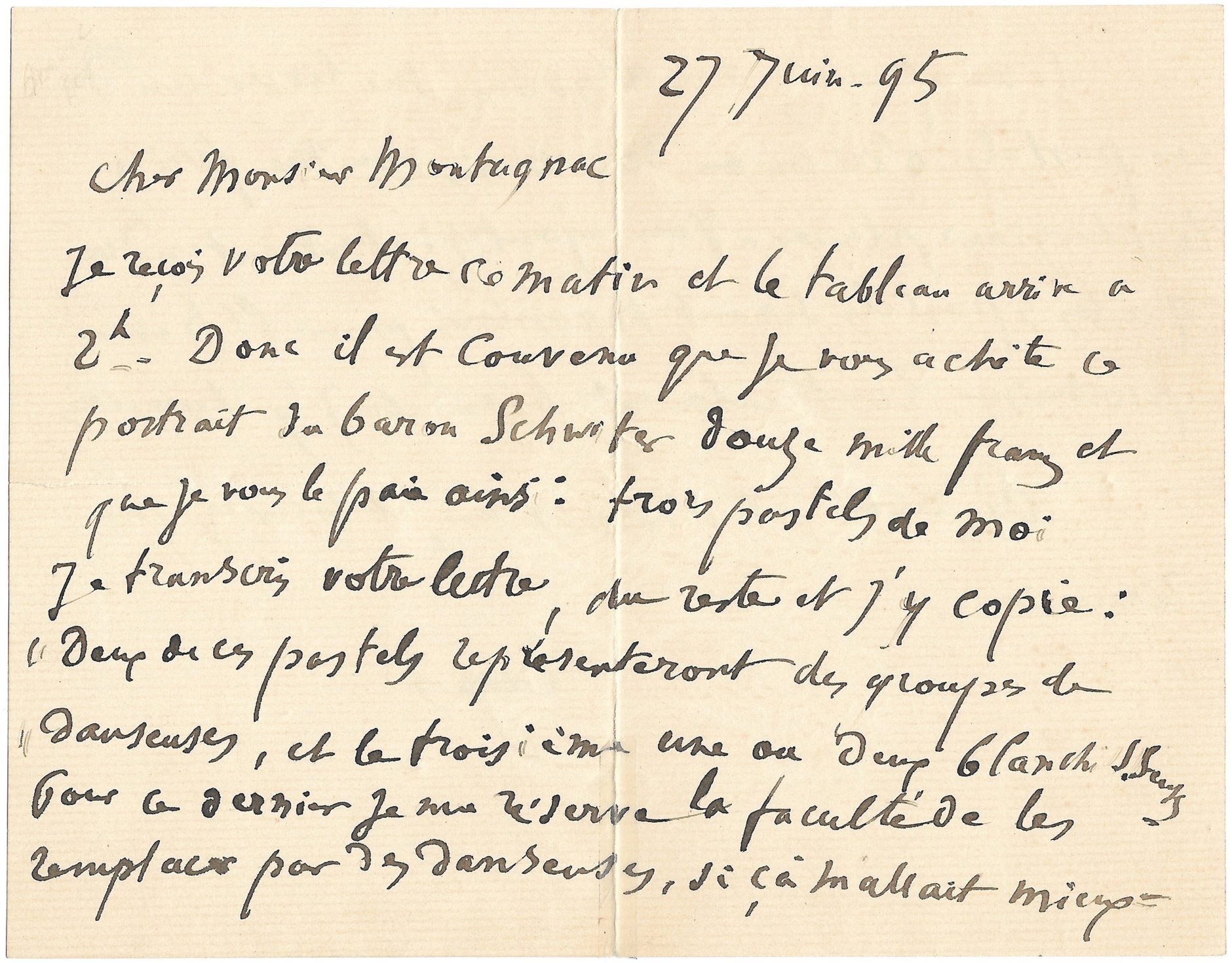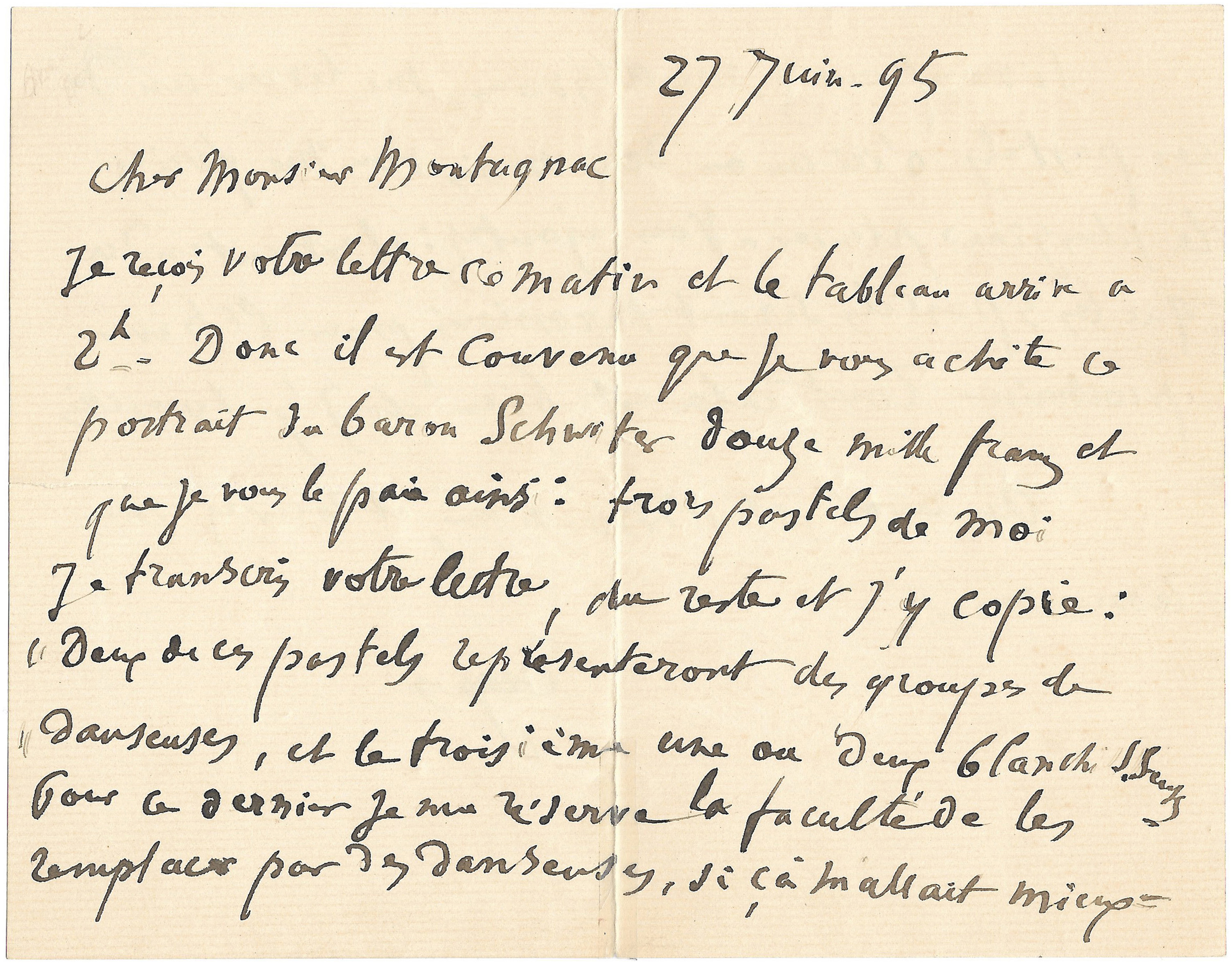 Je reçois votre lettre ce matin et le tableau [de Delacroix] arrive à 2h. Donc il est convenu que je vous achète ce portrait du baron Schwiter douze mille francs et que je vous paie ainsi : trois pastels de moi. Je transcris votre lettre, du reste j’y copie : Deux de ces pastels représenteront des groupes de danseuses, et le troisième une ou deux blanchisseuses. Pour ce dernier je me réserve la faculté de les remplacer par des danseuses, si ça m’allait mieux.