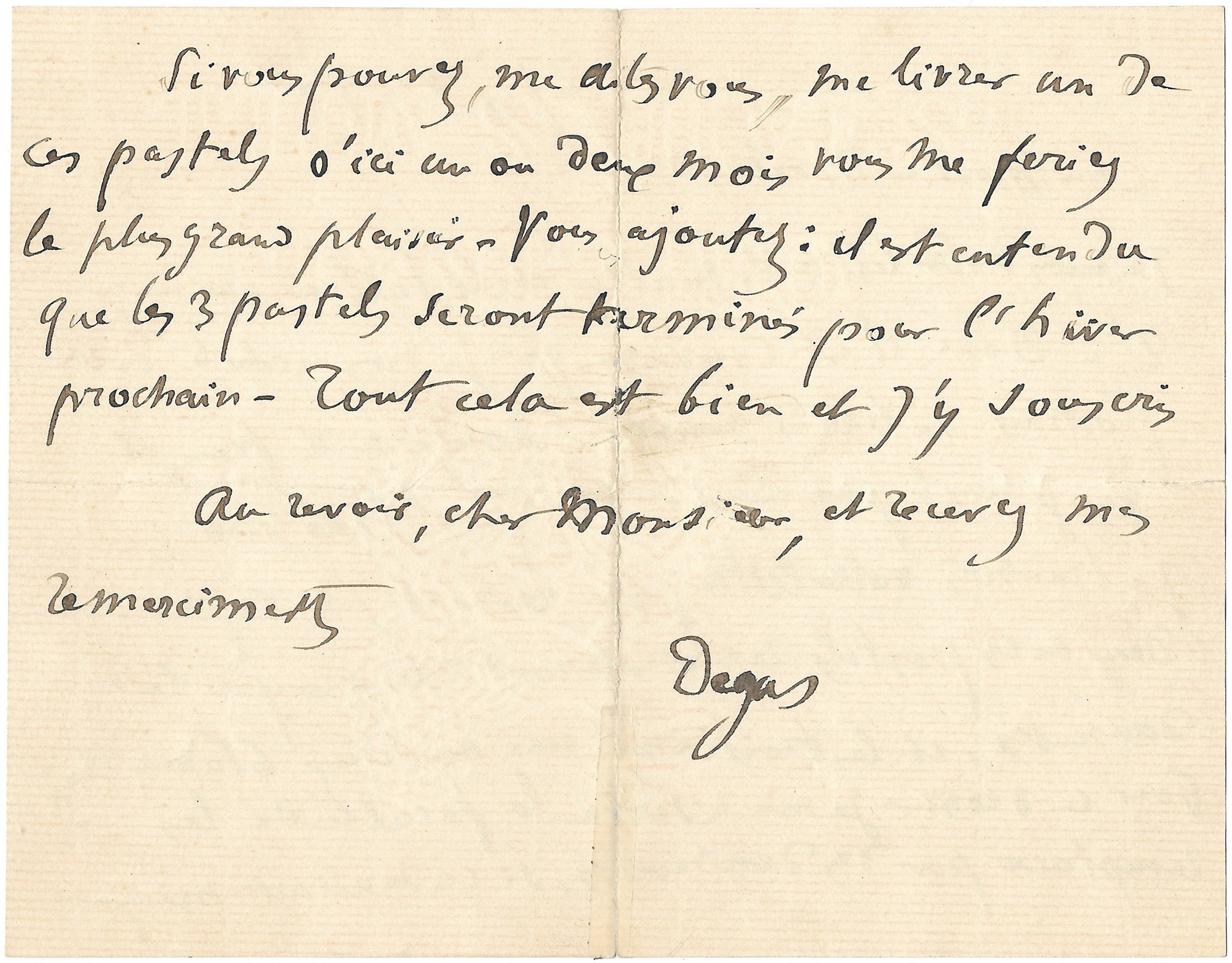 Si vous pouvez, me dites-vous, me livrer un de ces pastels d’ici un ou deux mois vous me feriez le plus grand plaisir. Vous ajoutez : Il est entendu que les 3 pastels seront terminés pour l’hiver prochain. Tout cela est bien et j’y souscris.