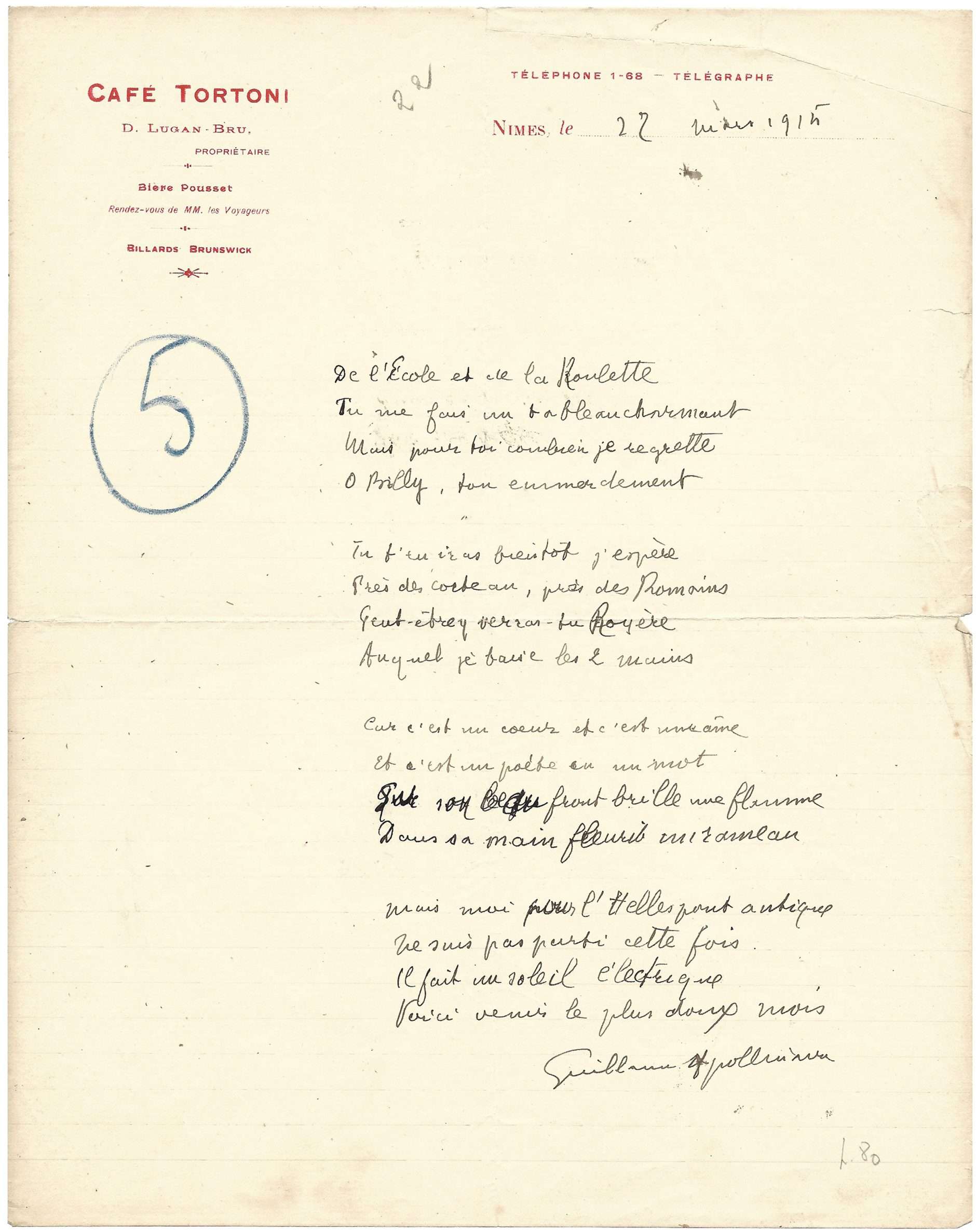 Billy, en mars 1915, était resté à Paris, où il s’embêtait, alors que Wilhelm de Kostrowitzky à la suite de son engagement volontaire faisait ses classes à Nîmes dans l’artillerie et usait abondamment du papier à lettres du café Tortoni où il avait ses habitudes. André Billy, qui taquinait aussi la muse, était journaliste et dès août 1915 il allait publier dans le Mercure de France une partie de leur « Correspondance poétique », en prenant soin cependant de ne pas écrire les noms en clair. Le numéro en bleu en marge du manuscrit est probablement destiné au Mercure. André Billy avait ainsi commenté cette publication quasi sur le vif : « De jeunes écrivains, arrachés par la guerre à leurs occupations favorites, ont adopté un usage charmant : ils correspondent en vers, ce qui prouve au moins, on en conviendra, un moral de tout repos. /Nous avons sous les yeux un certain nombre de ces épîtres poétiques. Souhaitons que quelqu’un, plus tard, les réunisse toutes. Elles constituent de précieux documents littéraires et psychologiques. ». C’est dire que ces poèmes écrits vite sans aucun doute étaient cependant plus ou moins clairement destinés à une publication. Les auteurs avaient conscience de la valeur de témoignage de ces échanges et soignaient leurs textes. Dès 1923, André Billy publia cette correspondance dans son Apollinaire vivant, avec ses propres poèmes qui éclairent les allusions d’Apollinaire : leurs amis communs, le cévenol Léo Larguier, qui sera blessé en septembre 1915 et siégera plus tard comme Billy à l’Académie Goncourt, le jeune Cocteau, Jules Romains. : des noms qui deviendront célèbres au XXe siècle. Ce poème empreint de nostalgie et de mélancolie est loin de manifester le moindre enthousiasme pour la guerre.