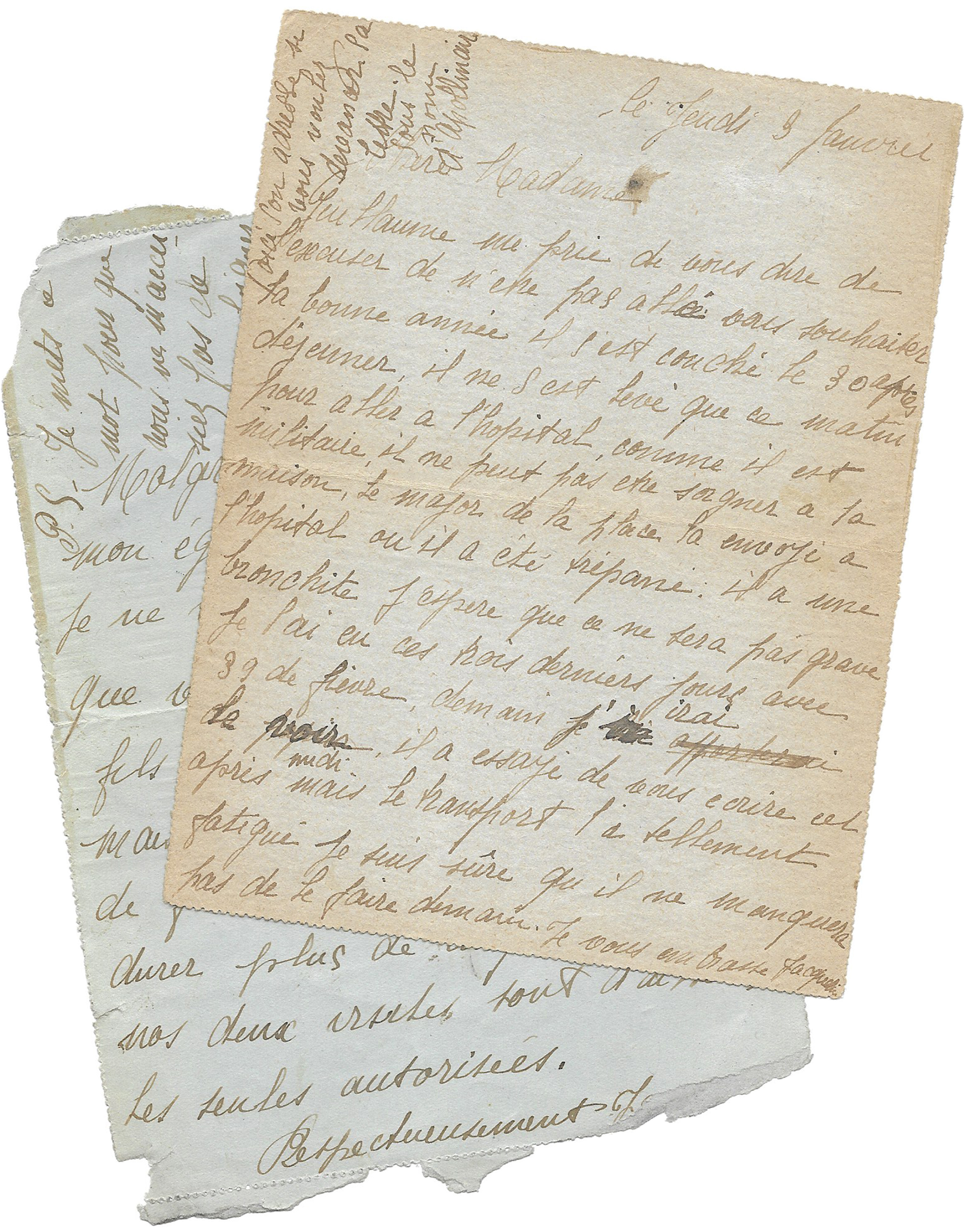 Guillaume me prie de vous dire de l’excuser de n’être pas allé vous souhaiter la bonne année. l s’est couché le 30 après déjeuner, il ne s’est levé que ce matin pour aller a l’hôpital, comme il est militaire, il ne peut pas etre soigner a la maison, Le major de la place la envoyé à l’hopital où il a été trépané [Villa Molière, hôpital militaire complémentaire du Val de Grâce à Paris]. Il a une bronchite, j’espère que ce ne sera pas grave. Je l’ai eu ces trois derniers jours avec 39 de fièvre. Demain j’apporterai j’irai le voir, il a essayé de vous écrire cet après-midi mais le transport l’a tellement fatigué je suis sûre qu’il ne manquera pas de le faire demain. Je vous embrasse Jacqueline »