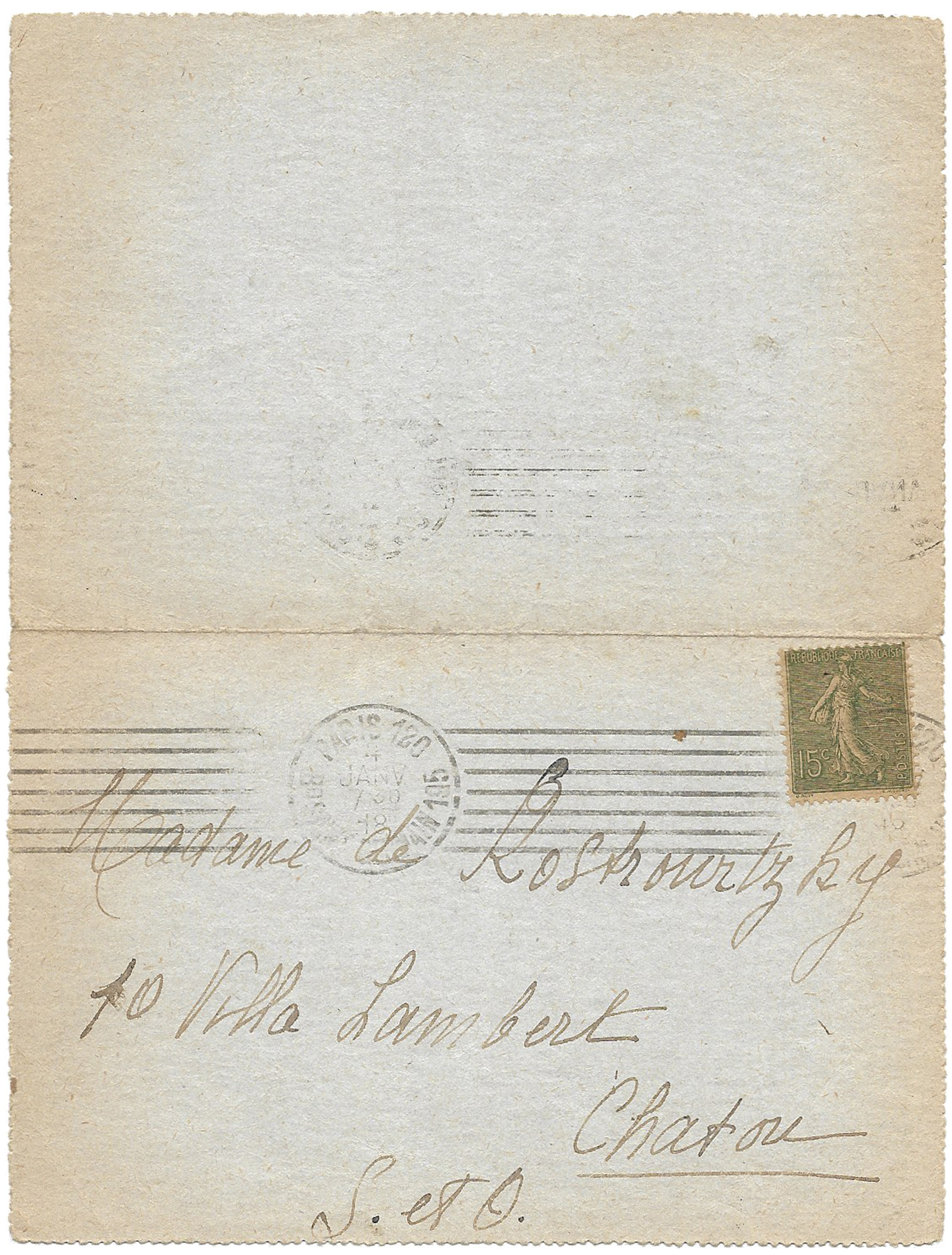 Jacqueline informe ici sa future belle-mère de l’hospitalisation de son fils. De nature irascible et ne supportant pas que son fils vive maritalement avec Jacqueline Kolb (ils ne se marieront que le 2 mai 1918), elle n’a sans doute pas apprécié que Jacqueline ait mis tant de temps à la prévenir de l’hospitalisation de son fils. La réponse de Jacqueline dans la seconde lettre vient confirmer cette hypothèse. Il est d’ailleurs intéressant d’observer la différence de décachetage entre les deux lettres. C’est manifestement ulcérée que Madame de Kostrowitsky ouvrit la seconde, arrachant comme par une étrange coïncidence la signature de Jacqueline. La tension entre les deux femmes était telle que la mère du poète après sa mort fit mettre les scellés sur son appartement. Il était aussi celui de Jacqueline qui s’empressa de les faire retirer.