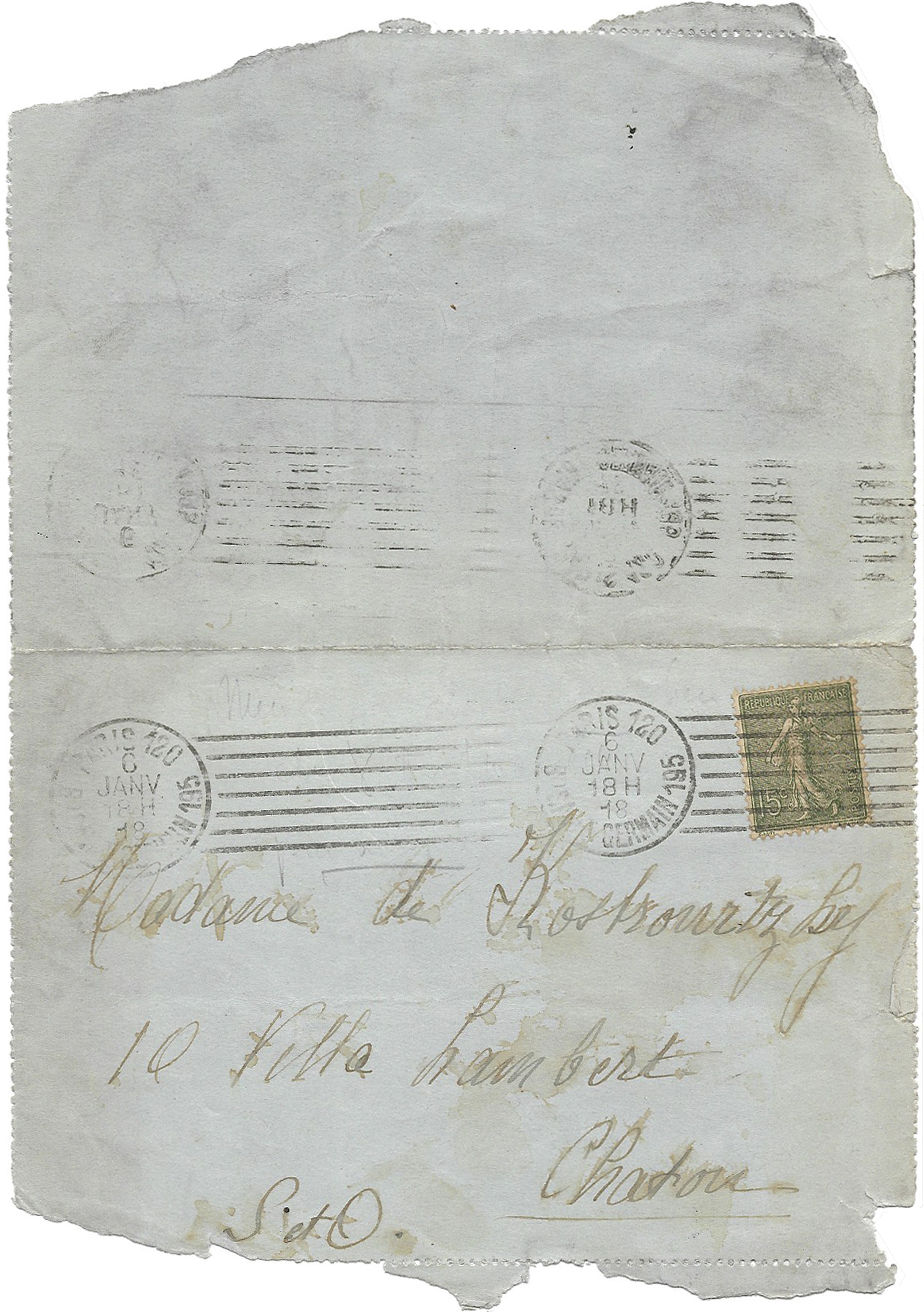 Déchirure à l’ouverture de la seconde lettre (signature manquante, ne reste que la lettre « J » de Jacqueline)