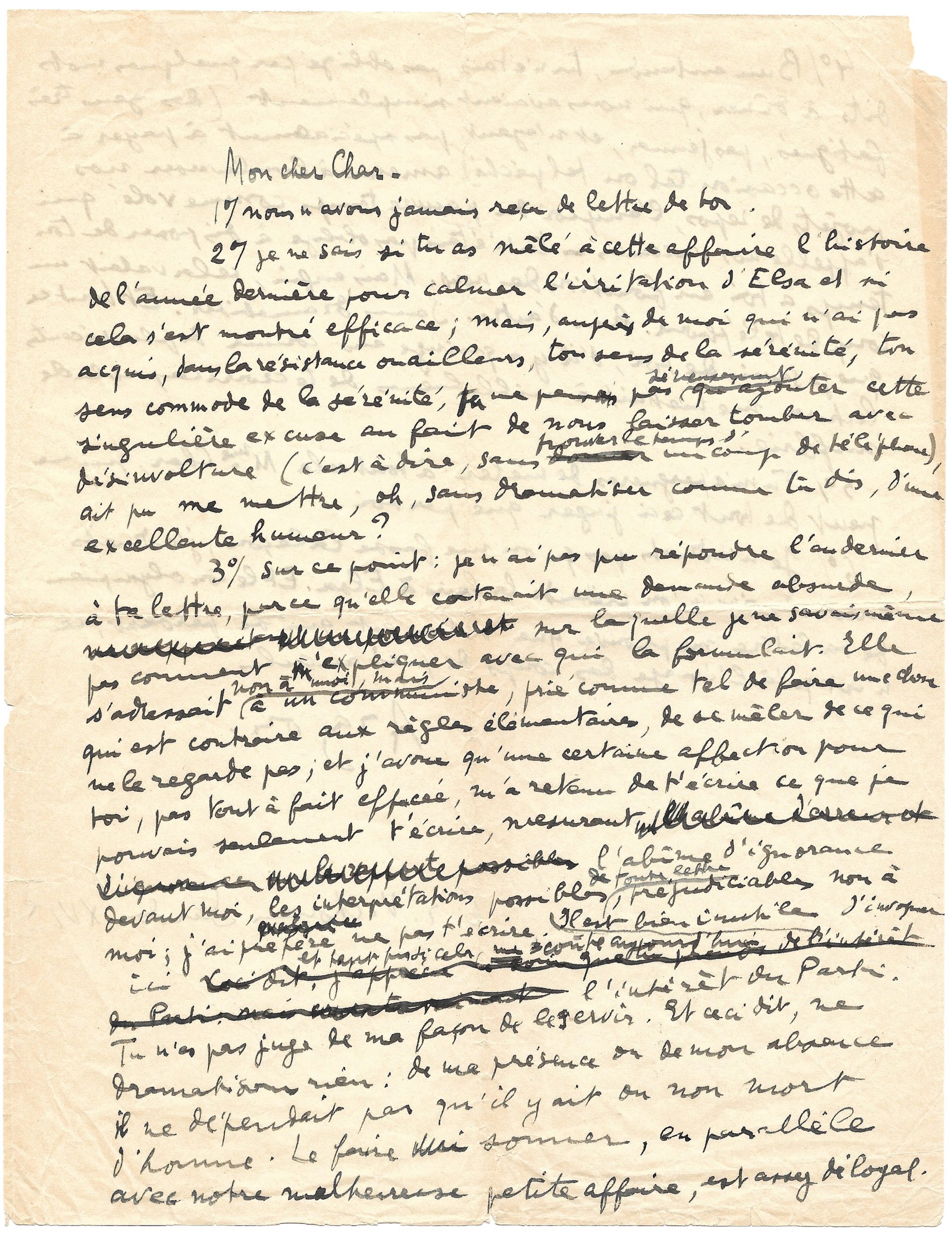 Le couple Aragon-Triolet entreprend un voyage en Provence en août 1946. L’écrivaine avait le projet d’un roman sur la Résistance et Char, qui avait eu d’importantes responsabilités régionales dans le maquis, avait visiblement accepté de lui donner certains renseignements ou contacts dans sa région. Elsa et Aragon font le déplacement à L’Isle-sur-la-Sorgue, mais Char leur fait faux-bond, retenu par la préparation d’un projet de film (Le Soleil des eaux) ; il les prévient par un message de sa femme qui arrive apparemment trop tard. D’où la remontrance d’Aragon sur la « muflerie » de Char, et sa volonté de défendre Elsa, qui avait de son côté envoyé à Char une lettre furieuse. Bref, une banale et fâcheuse histoire de rendez-vous manqué, de malentendu et de susceptibilité froissée.
