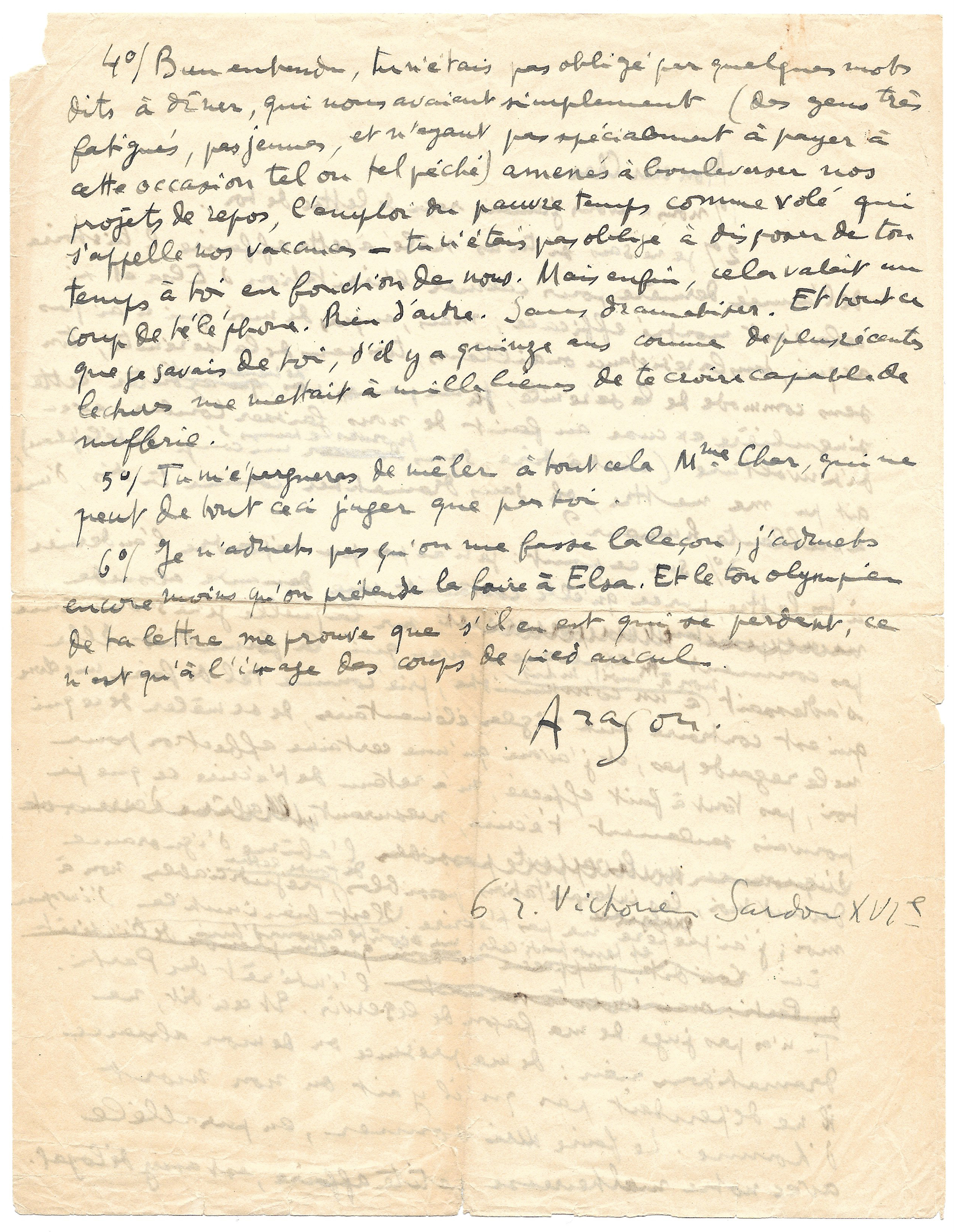 Lettre acerbe de Louis Aragon à René Char, énumérant ses griefs en six points