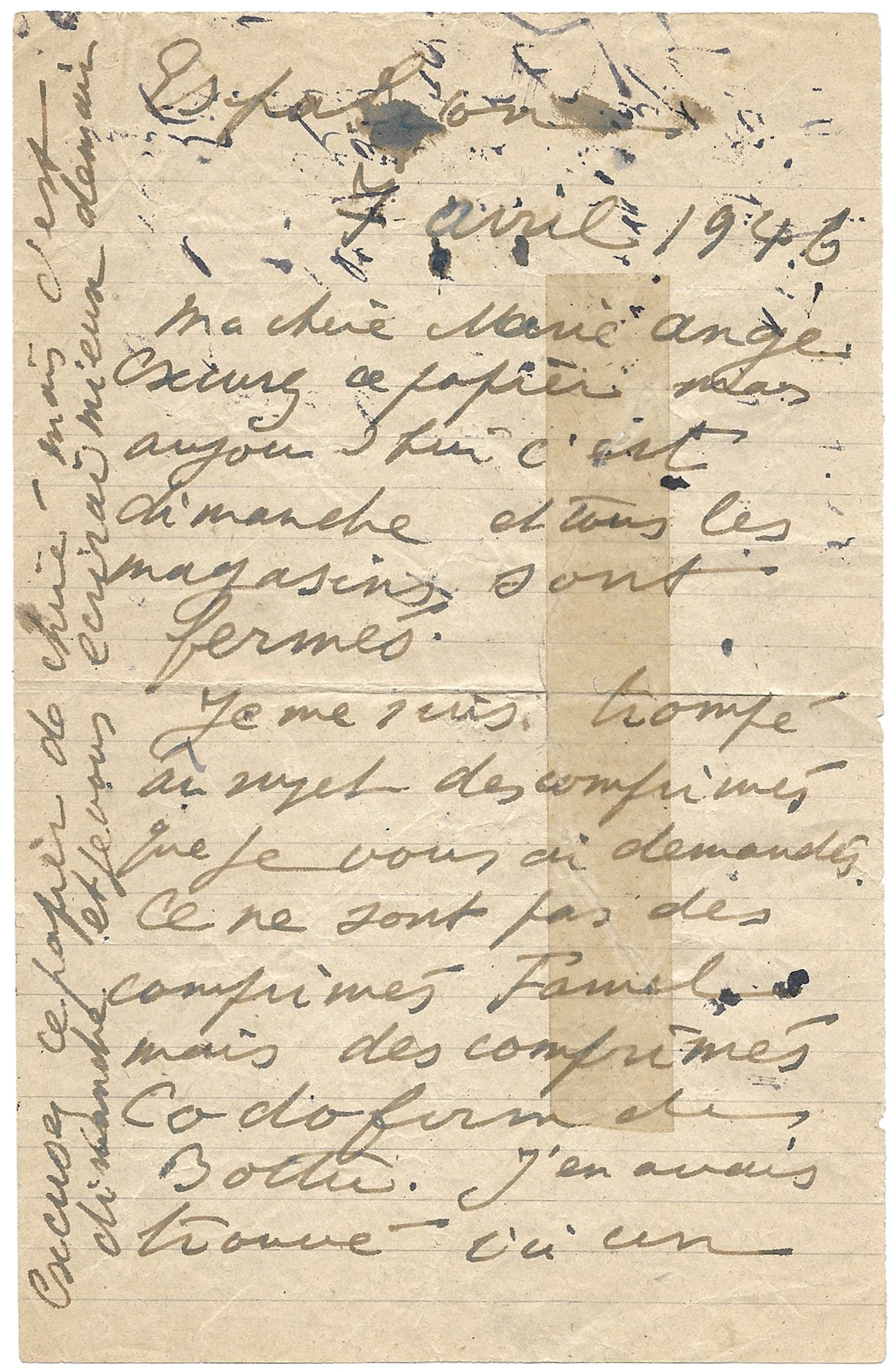 « Ma chère Marie-Ange excusez ce papier mais aujourd’hui c’est dimanche et tous les magasins sont fermés.