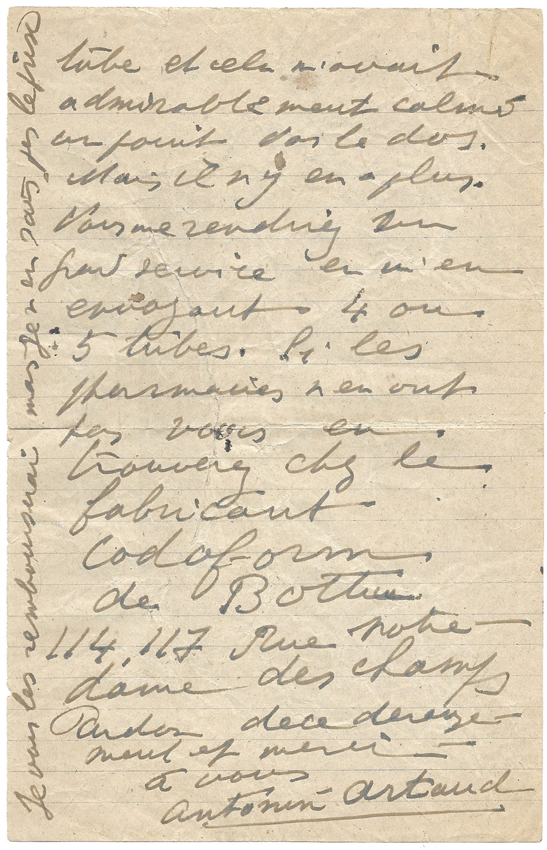 Cette lettre est écrite un mois avant son retour à Paris. En effet, après maintes suppliques du poète, Marthe Robert et Arthur Adamov, très choqués par l’environnement d’Artaud dans cet asile, considèrent qu’il est nécessaire et urgent qu’il revienne dans la capitale. Ce n’est qu’au terme de nombreuses négociations avec l’hôpital qu’ils obtiendront gain de cause. Il écrit deux jours plus tard – le 9 avril – à sa sœur s’excusant du « papier déchiré et taché » de cette lettre en expliquant qu’il lui fallait ses médicaments en hâte.
