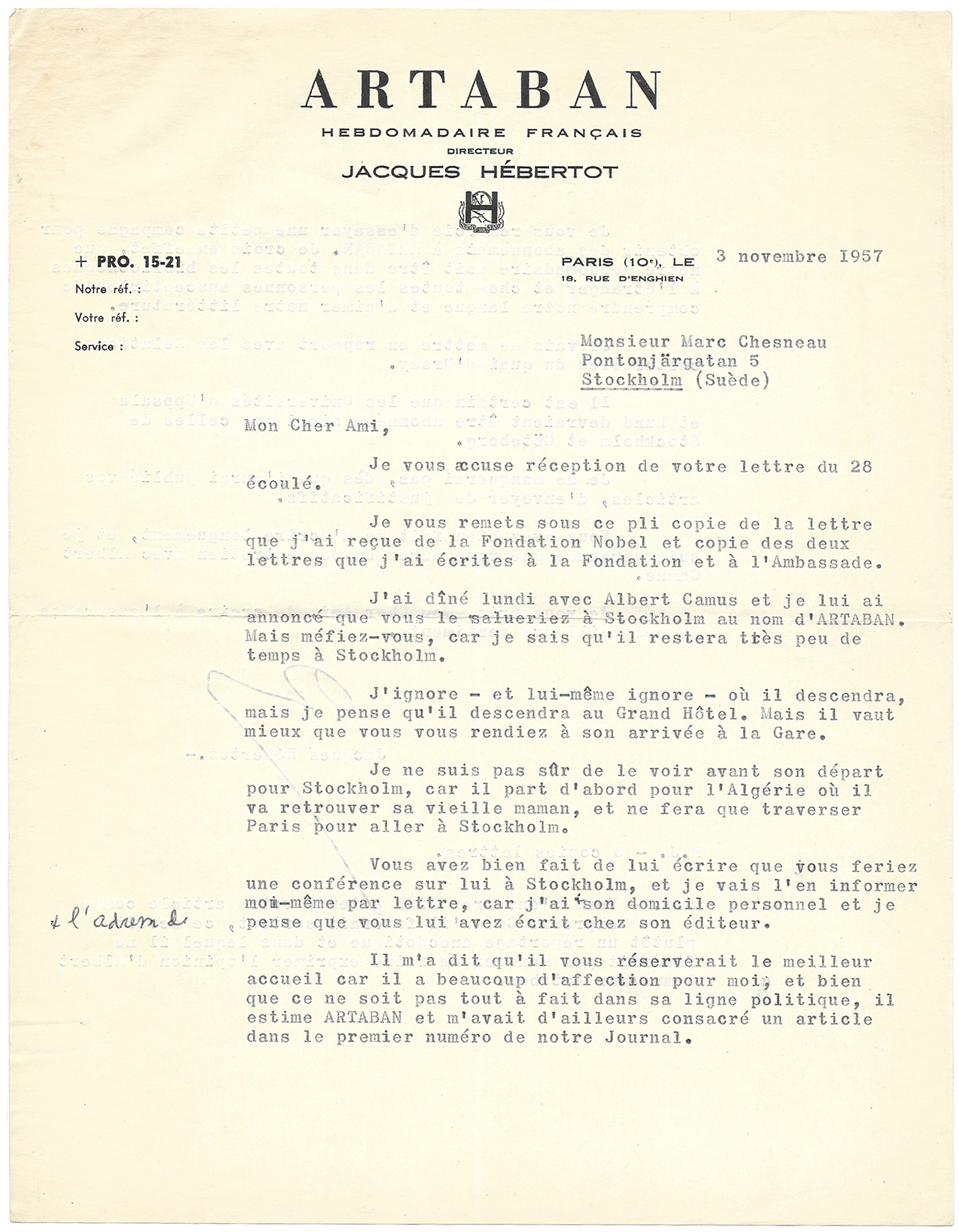 J’ai dîné lundi avec Albert Camus et je lui ai annoncé que vous le salueriez à Stockholm au nom d’ARTABAN. Mais méfiez-vous, car je sais qu’il restera très peu de temps à Stockholm.