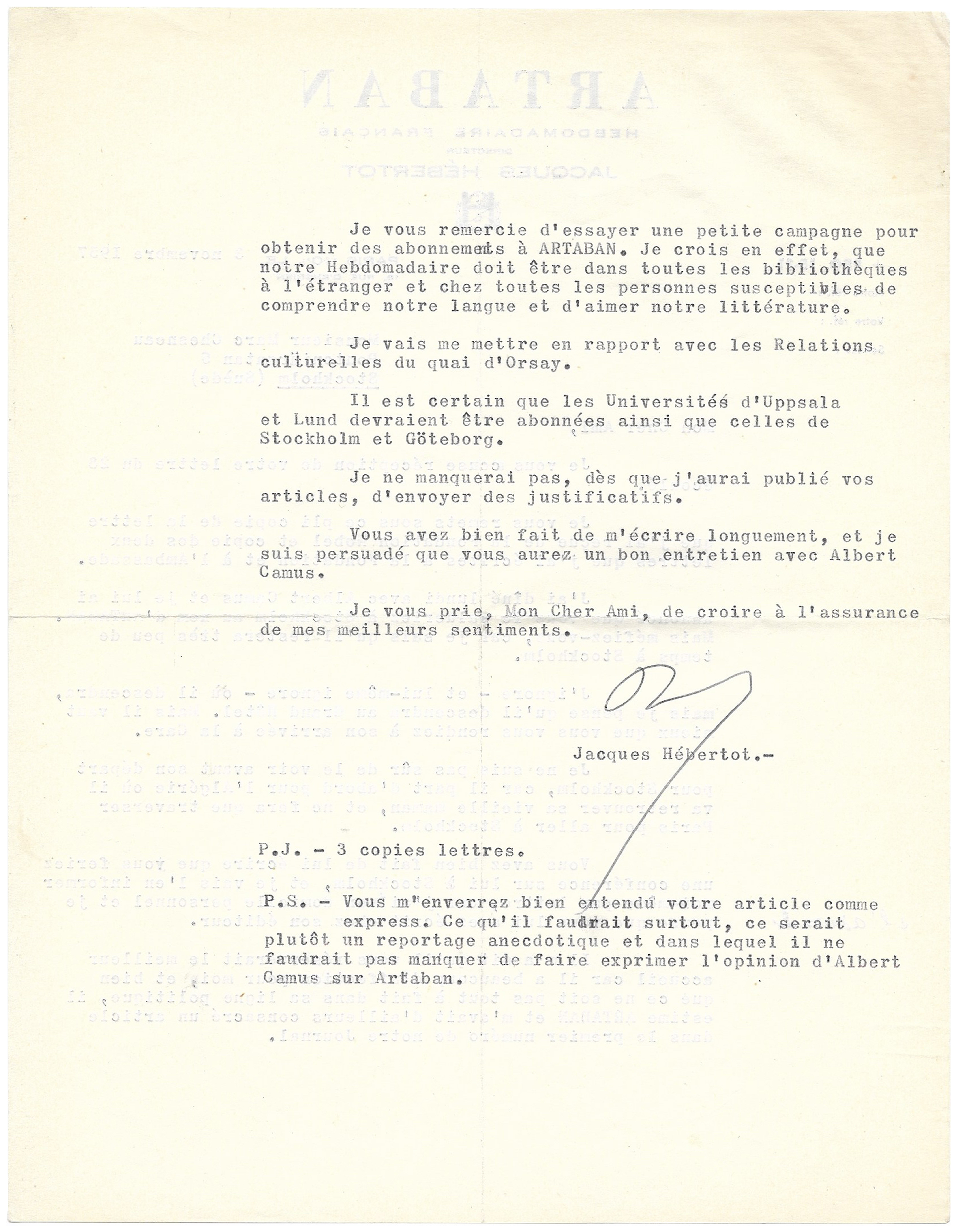 P.S. — Vous m’enverrez bien entendu votre article comme express. Ce qu’il faudrait surtout, ce serait plutôt un reportage anecdotique et dans lequel il ne faudrait pas manquer de faire exprimer l’opinion d’Albert Camus sur Artaban. »
