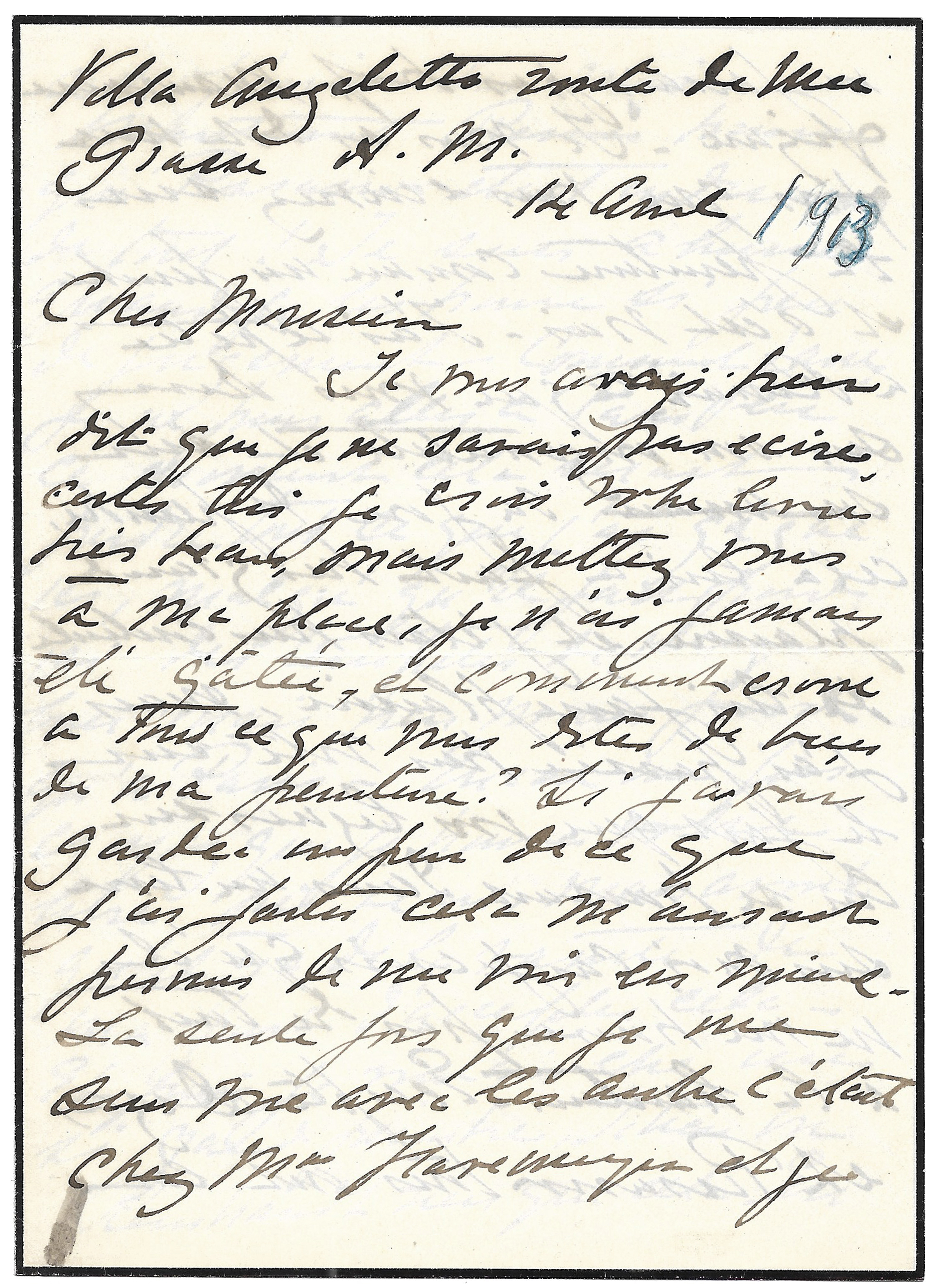 Villa Angeletto – Grasse, 14 avril [1913, d’après une inscription d’une autre main], 6 p. in-8° sur papier de deuil