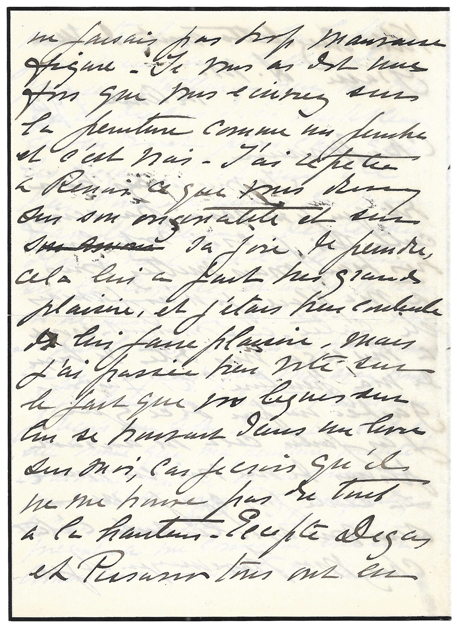 « Cher Monsieur, Je vous avais bien dit que je ne savais pas écrire. Certes oui je crois votre livre* très beau mais mettez-vous à ma place, je n’ai jamais été gâtée, et comment croire à tout ce que vous dites de bien de ma peinture ? Si j’avais gardé un peu de ce que j’ai fait, cela m’aurait permis de me voir en mieux. La seule fois que je me suis vue avec les autres, c’était chez Mme Havemeyer** et je ne faisais pas trop mauvaise figure. Je vous ai dit une fois que vous écriviez sur la peinture comme un peintre et c’est vrai. J’ai répété à Renoir ce que vous disiez sur son originalité et sur sa joie de peindre, cela lui a fait très grand plaisir, et j’étais bien contente de lui faire plaisire [sic], mais j’ai passée [sic] bien vite sur le fait que vos lignes sur lui se trouvai[en]t dans un livre sur moi, car je crois qu’il ne me trouve pas du tout à la hauteur.